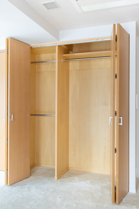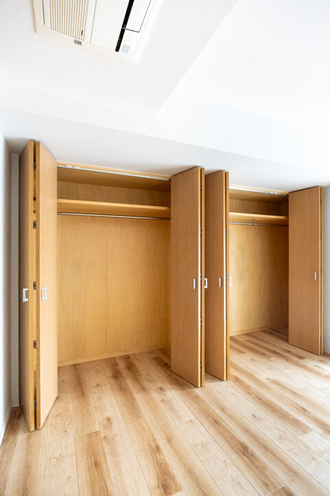 約7.4帖の寝室2。西向きの窓から明るい光が差し込みます。壁いっぱいにクローゼットが並ぶ、収納性の高さが魅力的。開口部分が大きく、荷物を出し入れしやすいのもポイントです。お部屋がすっきり片付きそうですね。子ども部屋におすすめです。
