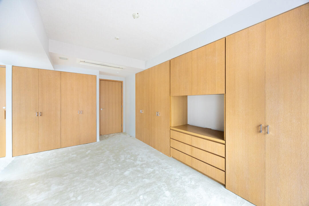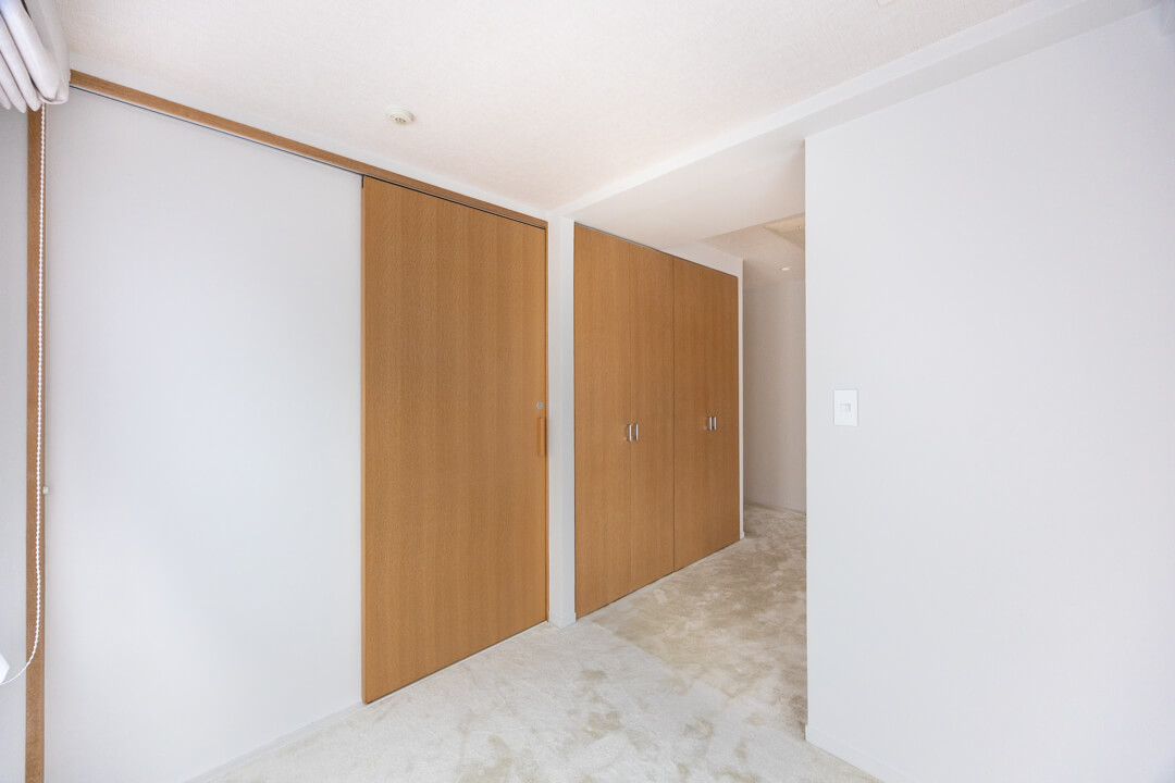 約9.2帖の寝室1。ゆとりある広さで主寝室にぴったりです。ふかふかとしたカーペットフロアで、冬場もスリッパいらず。素足で心地よく、開放的に過ごせそうです。収納豊富で居室空間を有効活用できるのも嬉しいポイントです。