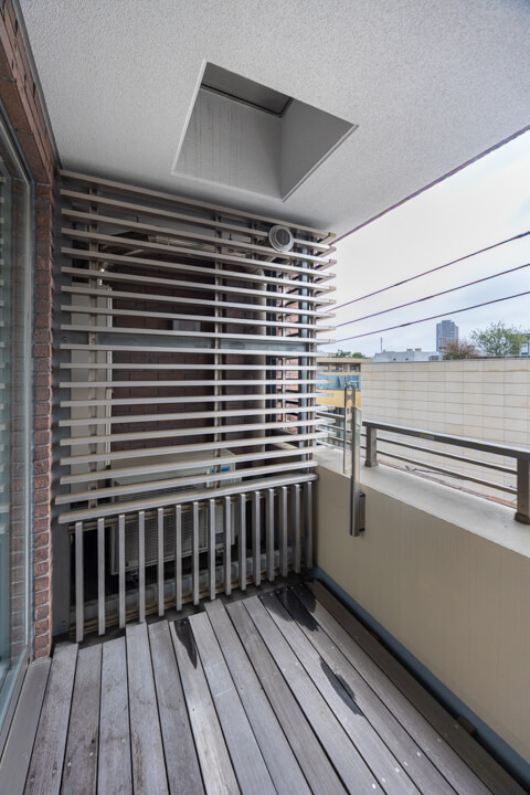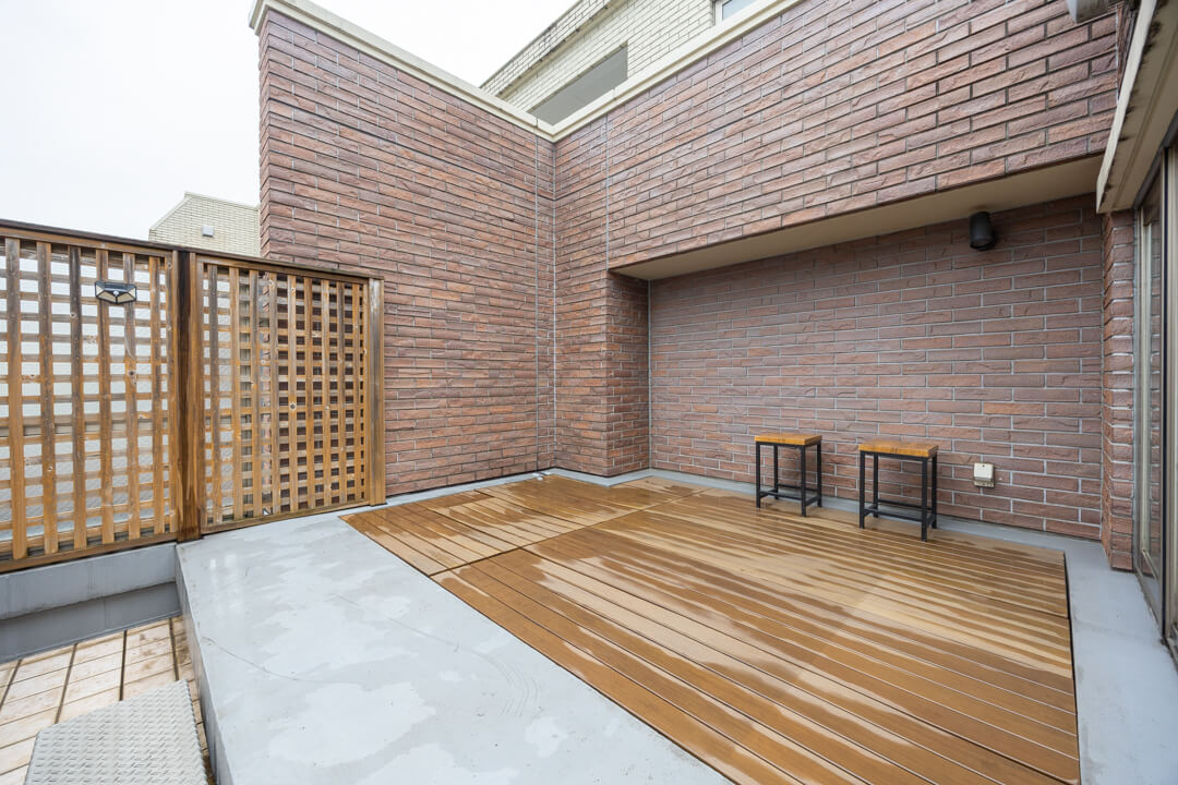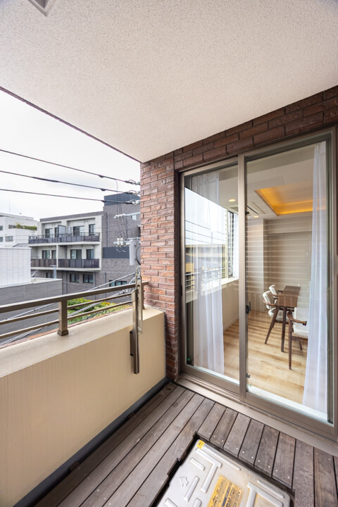 LDKに接続するバルコニー。9.8㎡です。撮影日はあいにくのお天気でしたが、南向きのため晴れの日にはあたたかい太陽光が届きそう。第二種低層住居専用地域に位置しているため、のどかな眺めです。ウッドデッキが敷かれているのも嬉しいですね。