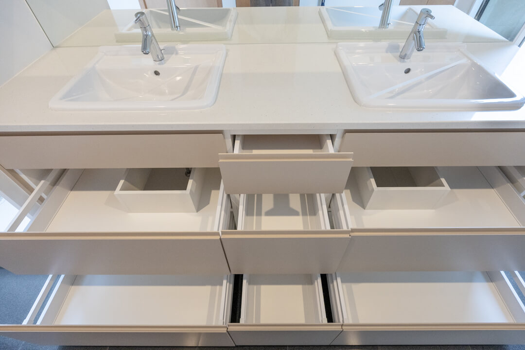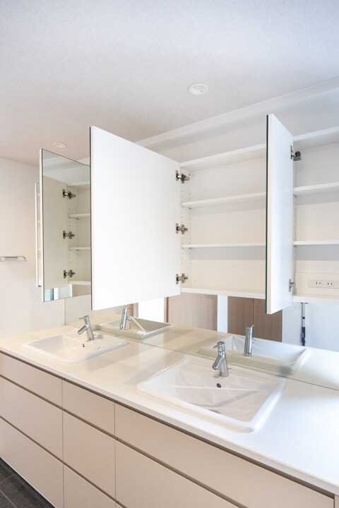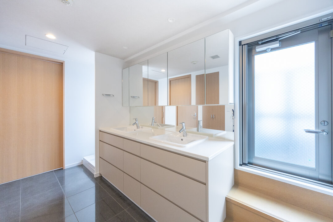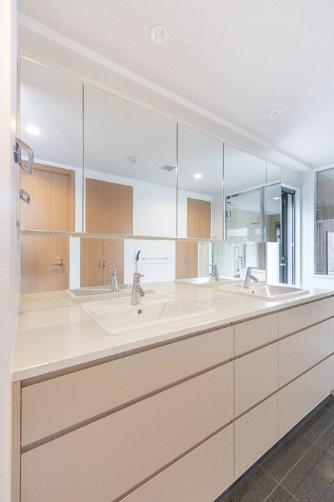 脱衣スペースを兼ねた洗面室はゆとりのある空間。ルーフバルコニーに接続し、明るい自然光が入ります。洗面化粧台は白基調で清潔感のある印象。2ボウル仕様なので2人並んで使用でき、忙しい朝の身支度もスムーズに行えそうです。ミラーボックスや足元の引き出し、リネン庫など、収納スペースも充実していて、いつも清潔な洗面室をキープできます。
