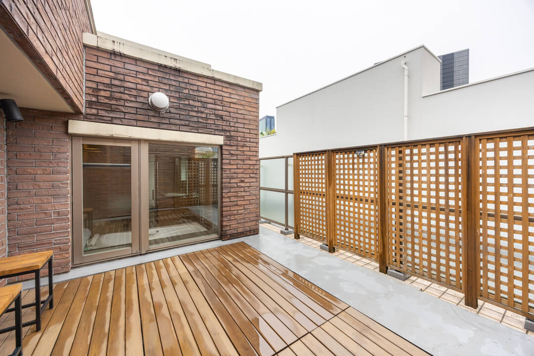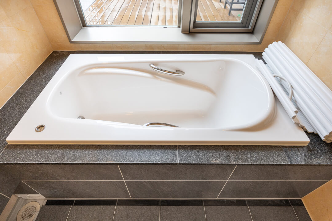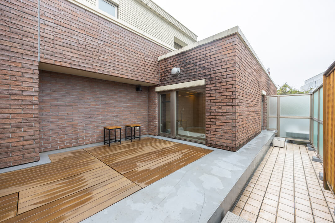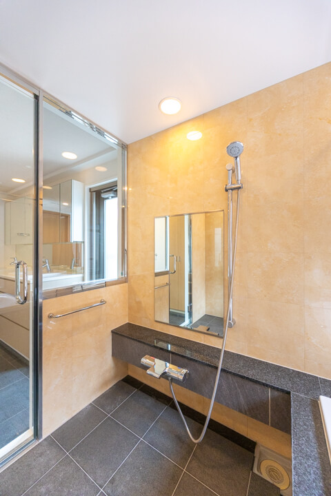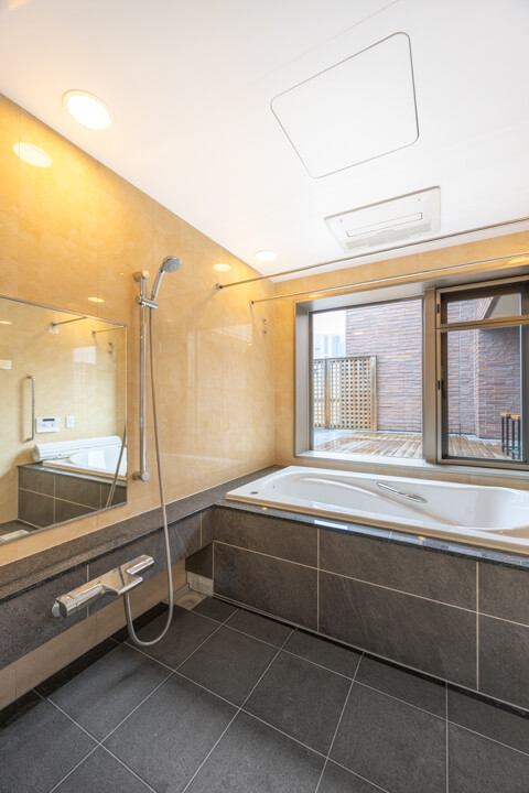 浴室の奥には広々としたバスコートを完備。浴室に開放感が生まれ、光と風を取り込むことができます。入浴しながら屋外を眺めたり、ちょっと外に出てリラックスタイムを過ごしたり。緑を置いても素敵ですね。布団や洗濯物を干すスペースとしても重宝しそうです。
