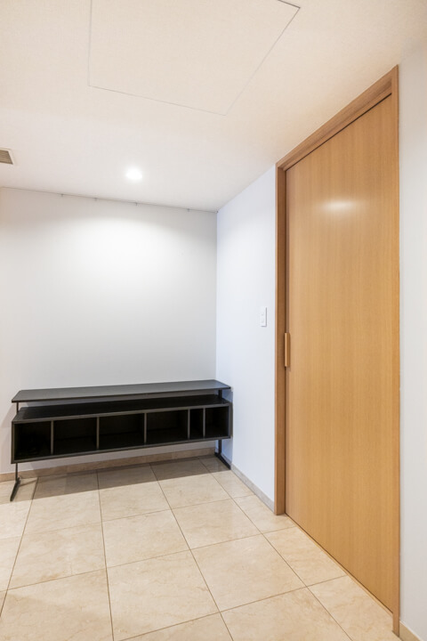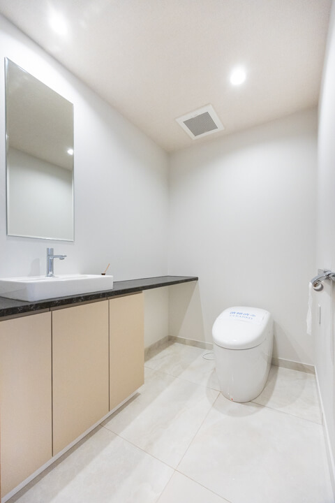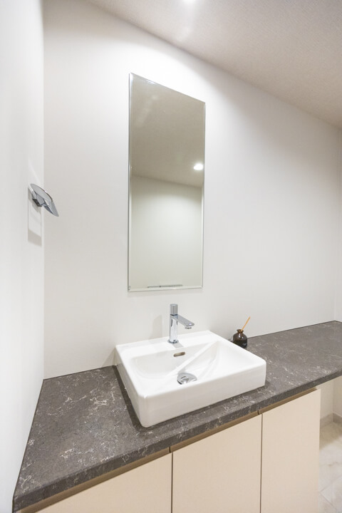 廊下に面していて独立性の高いレストルーム。手洗いカウンター付きのスタイリッシュな空間です。すぐに手を洗うことができ、ゲストを洗面室まで案内する手間がかからないのが嬉しいですね。鏡でさっと身だしなみチェックもできますよ。