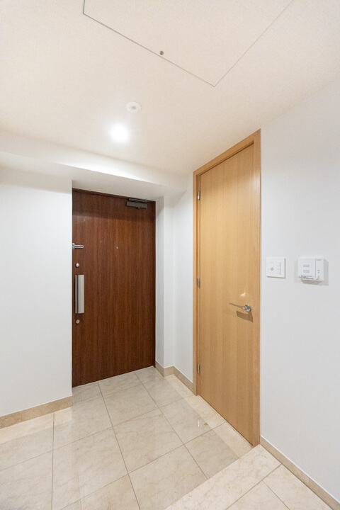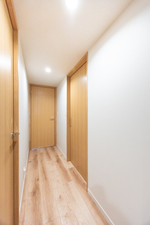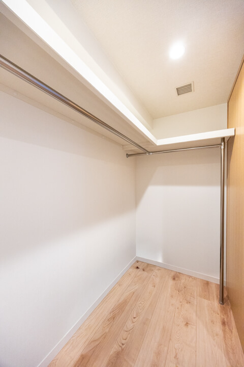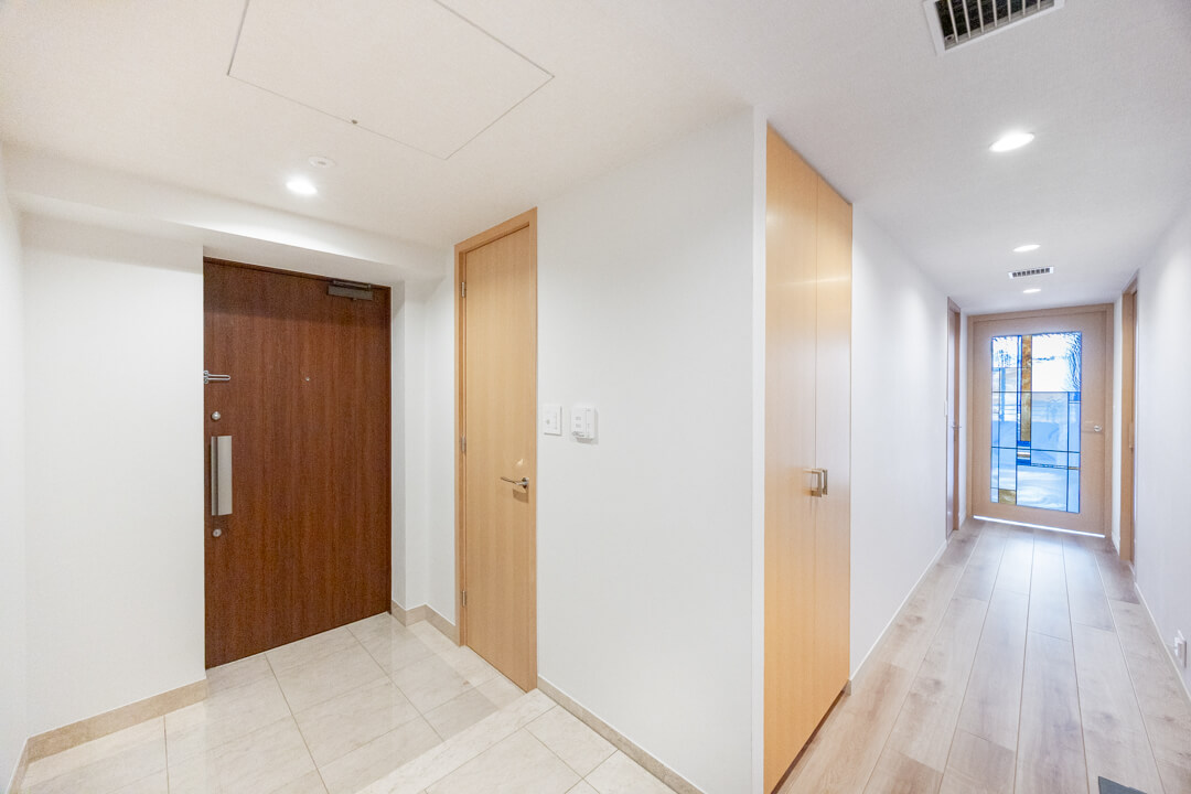 光沢あるフロアで高級感の漂う玄関。SIC(シューズインクローゼット)完備で散らかりがちな靴をすっきり収納できます。傘やベビーカーも収納できて嬉しいですね。廊下にも物入と納戸があり、収納スペースが充実しています。納戸にはハンガーパイプが設置されているので、ファミリークローゼットとして活用できますよ。トランクケースや季節家電といった大きな荷物も収納でき、すっきりとした居住空間を実現できそうです。