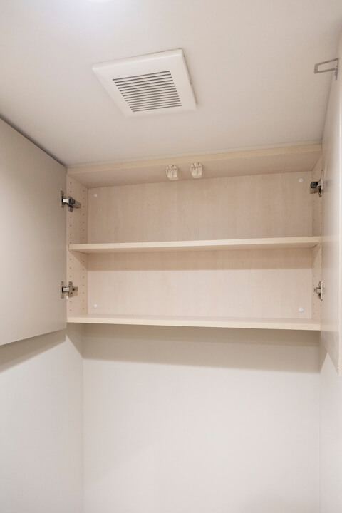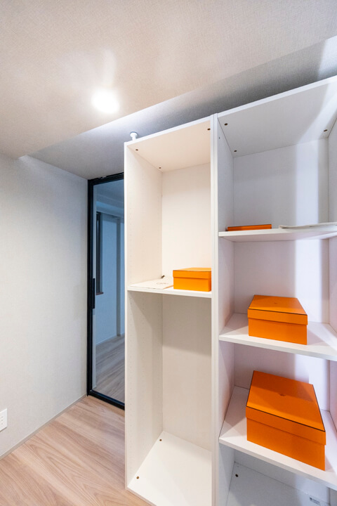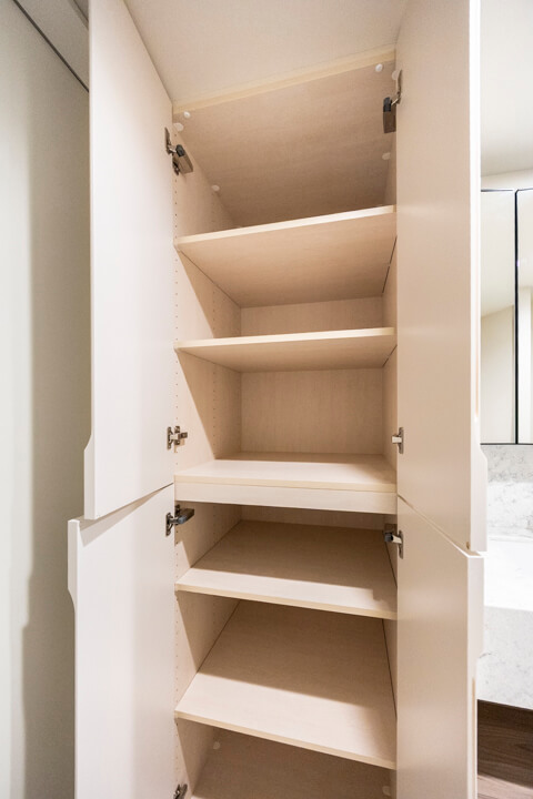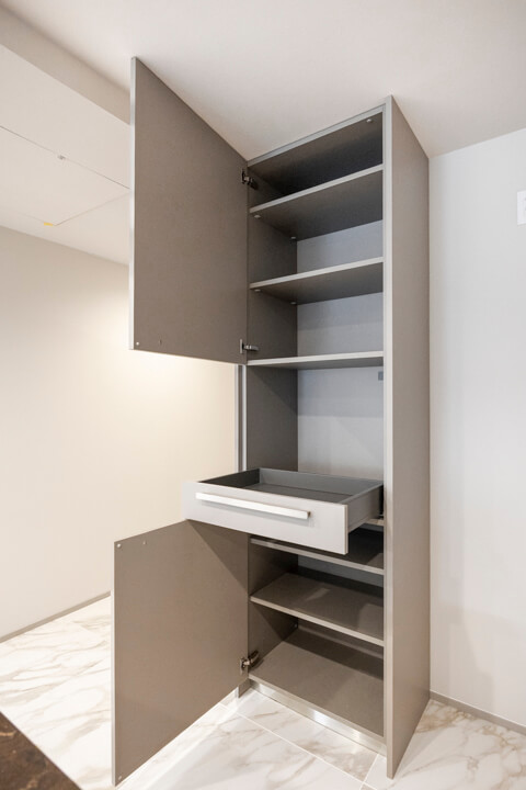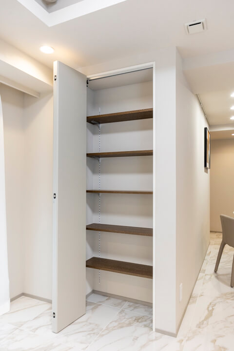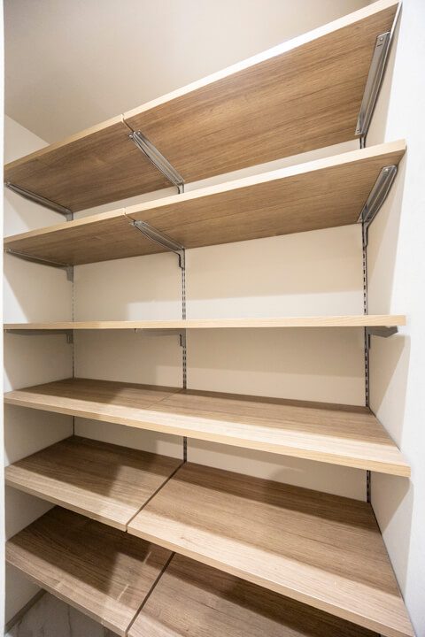入口付近にはパントリーが造られています。中には可動棚が設置されており、ストック類や保存食品なども収納できますよ。
