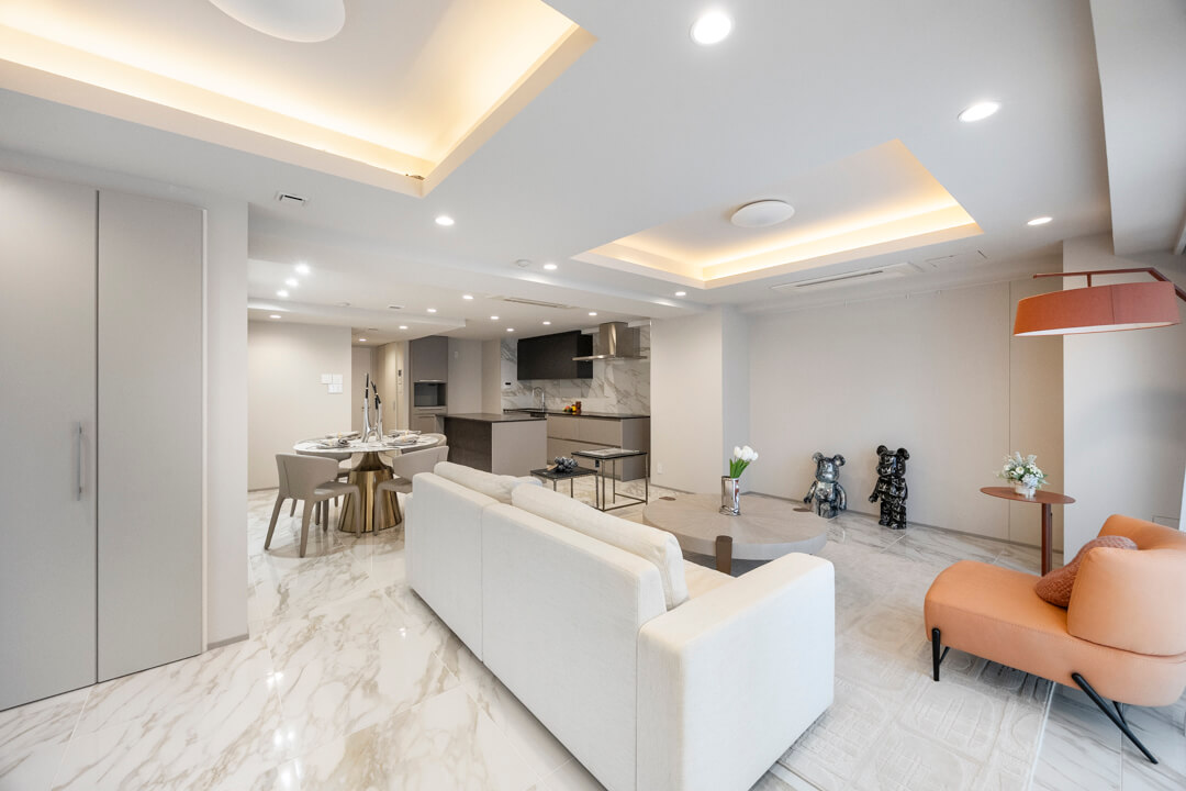 約28.3帖の広々としたリビングダイニングキッチンです。二面採光のため開放感があり、通風も良好。折り上げ天井には間接照明があしらわれていて、お部屋を上品な雰囲気に包んでくれています。また、窓からは東京タワーが望めます。