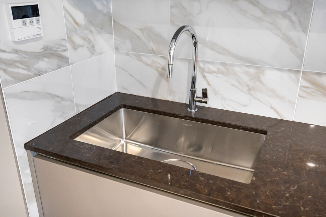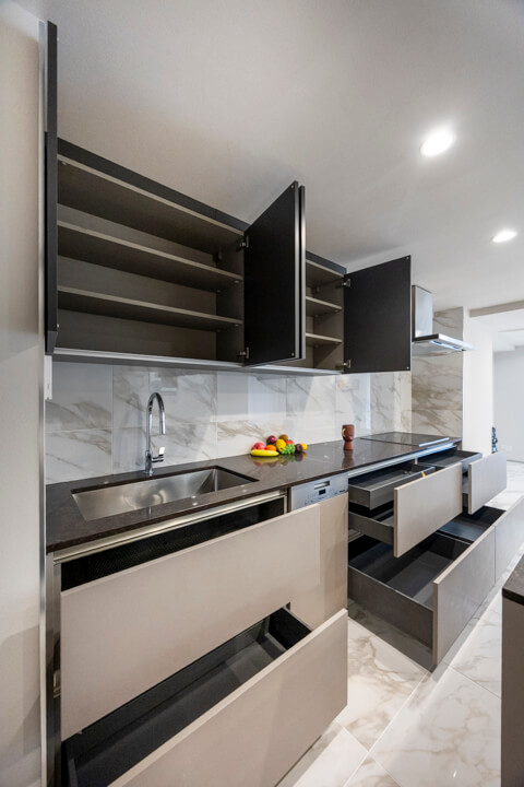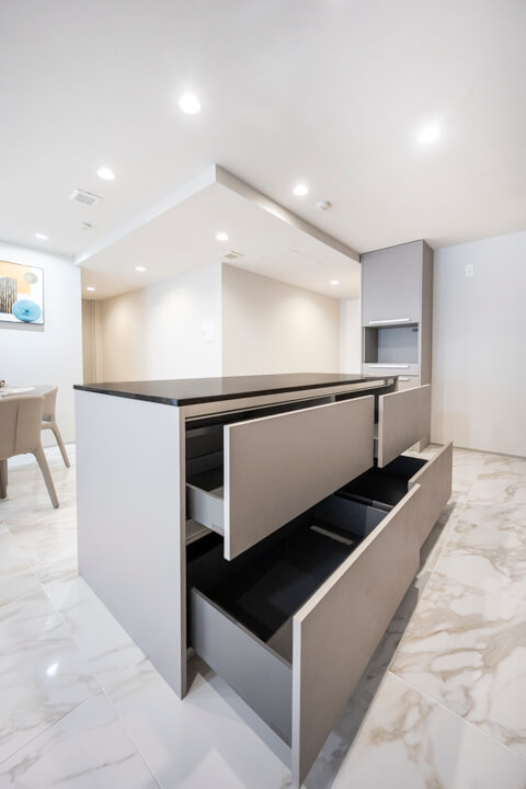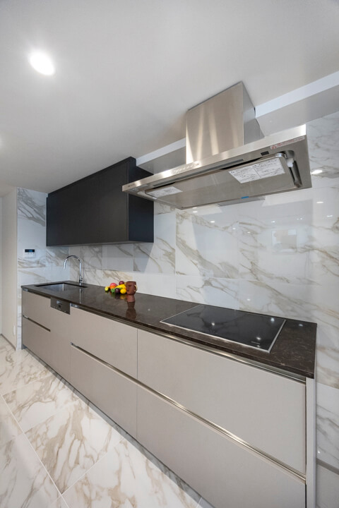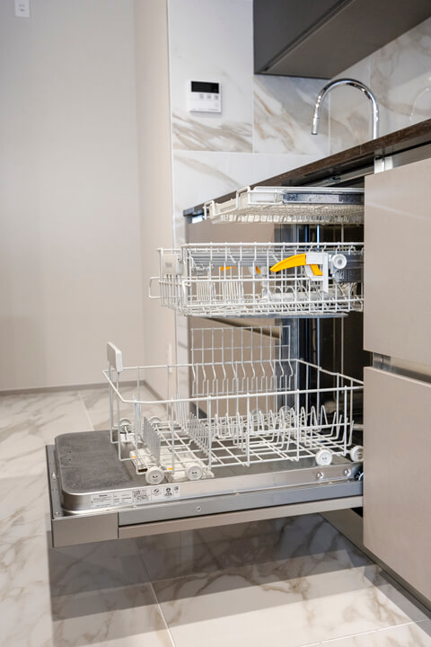 ドイツの高級家電ブランドMiele(ミーレ)製の大型食洗機です。大きなサイズ感でパーティーや来客時での後片付けの負担を大幅に軽減してくれます。また、静音設計でマンションでも嬉しく、省エネ性能にも優れていますよ。さらに、IHクッキングヒーターもMiele(ミーレ)製。ミニマルなデザインかつ機能面、お手入れのしやすさも◎。