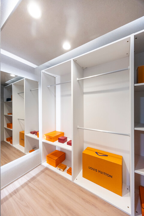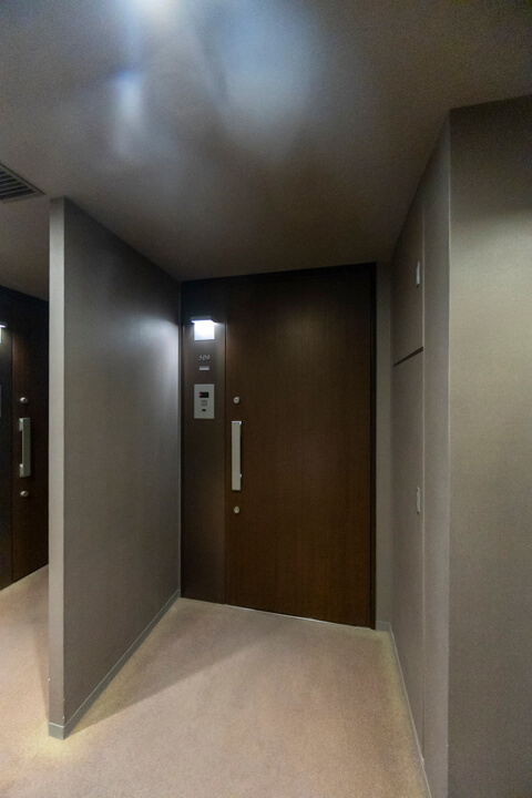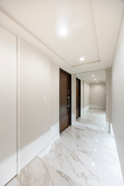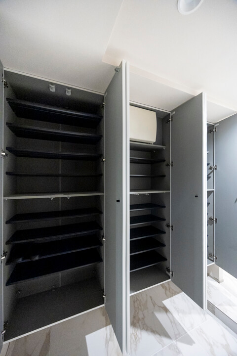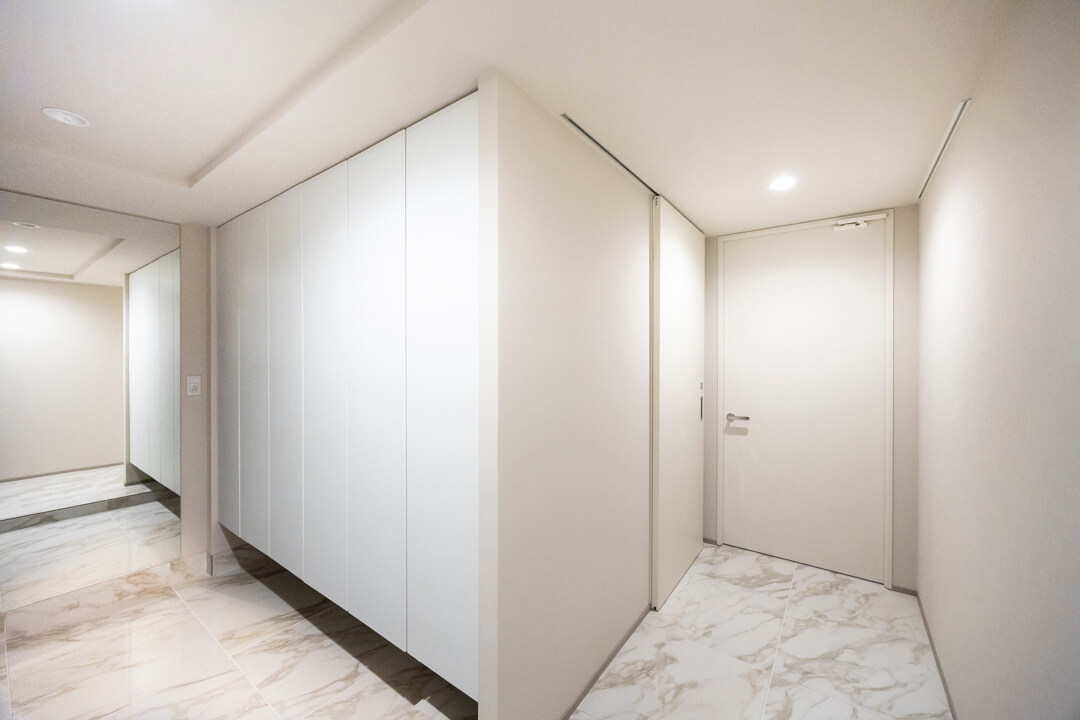 高級感が漂う玄関には大きなミラーが設置されているので、出かける際に全身のコーディネートをチェックすることができて便利です。また、背の高いシューズボックスが備え付けられていますが、フロートタイプのため空間に圧迫感を与えません。