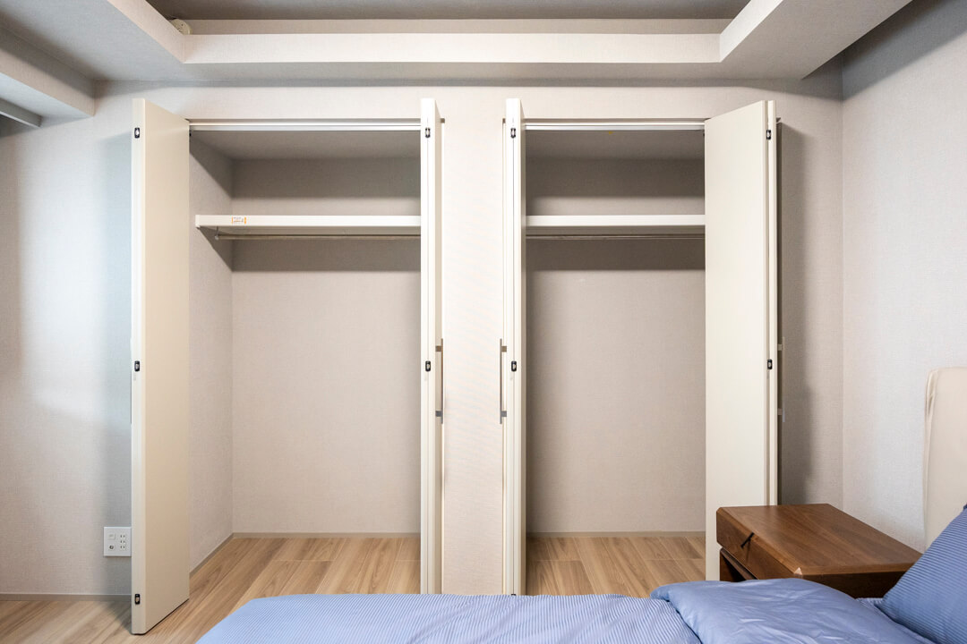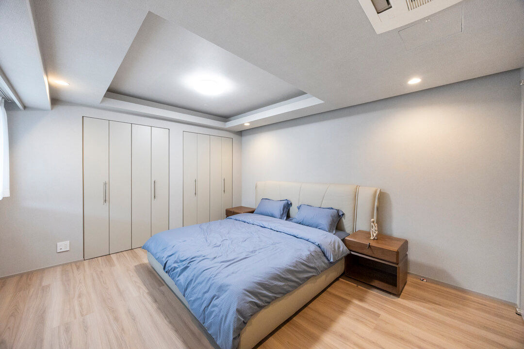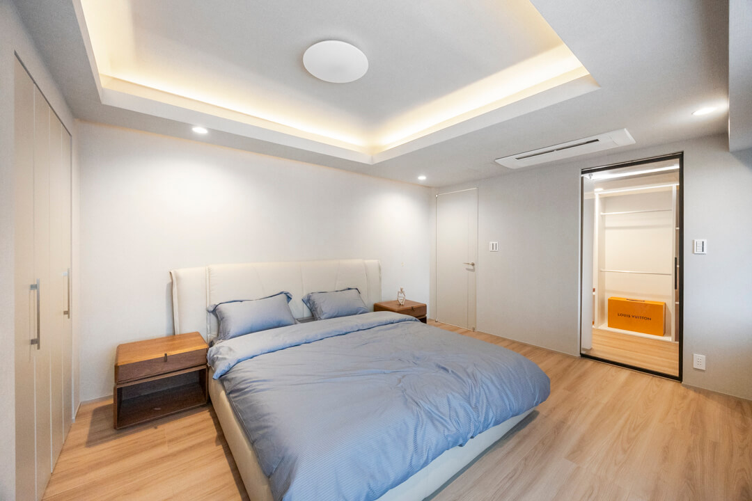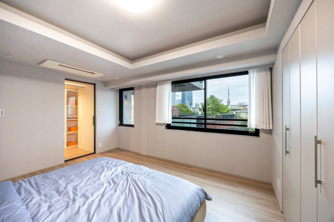 約9.6帖のゆったりと過ごせる寝室です。大きめのベッドも配置できて◎。折り上げ天井+間接照明もくつろぎの空間を演出してくれていますね。また、クローゼットだけでなく、ウォークインクローゼットも造られています。洋服や大きめの荷物などもきちんと収納できて便利です。こちらのお部屋の窓からも東京タワーが望めます。