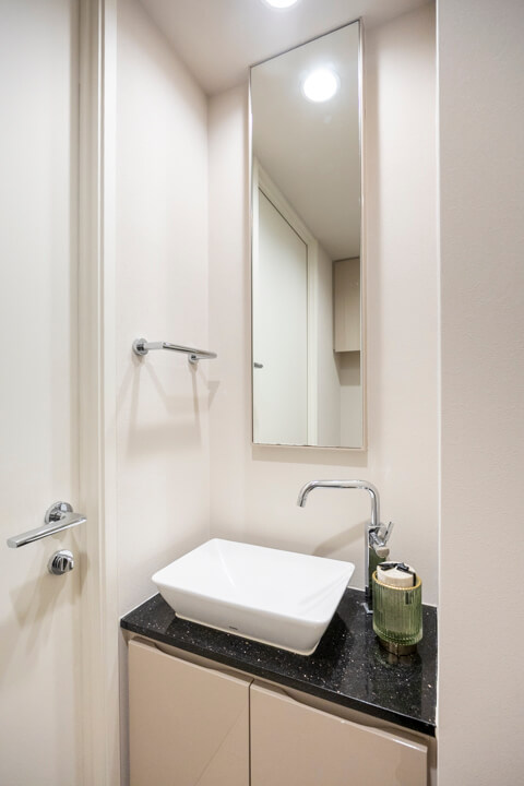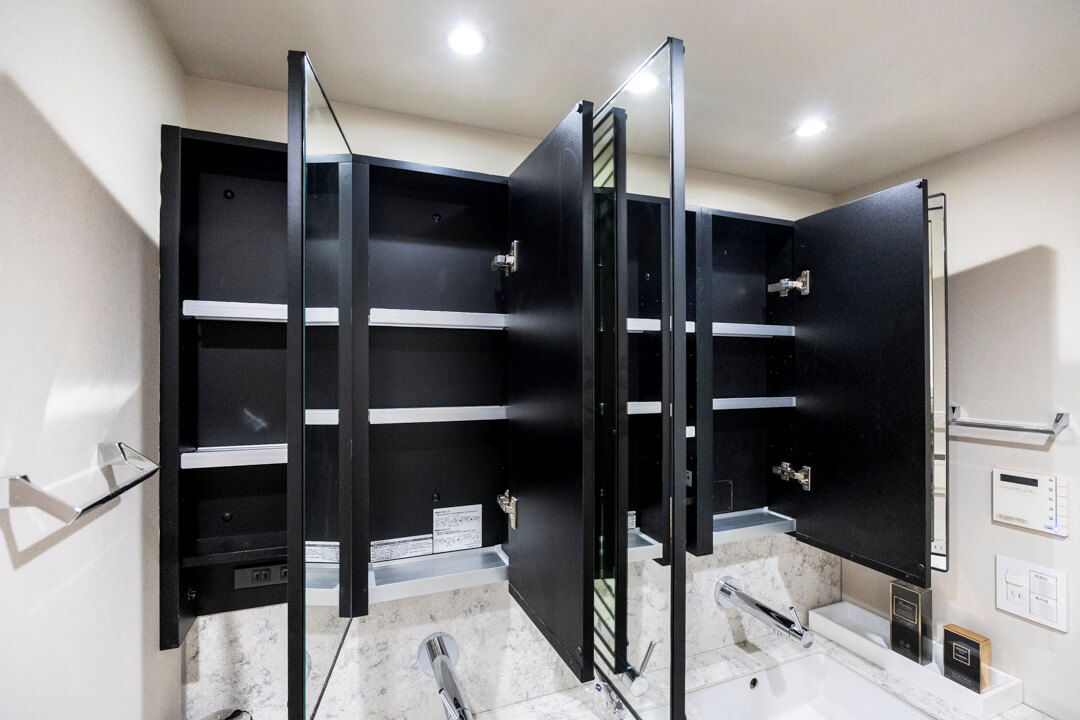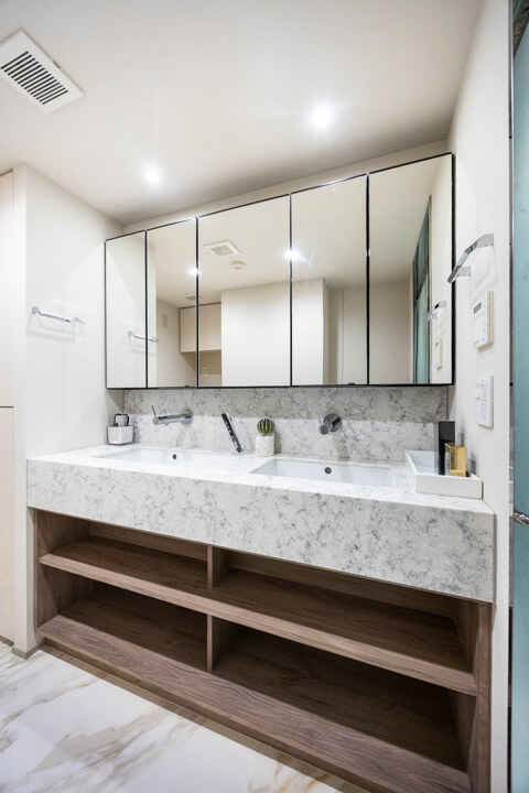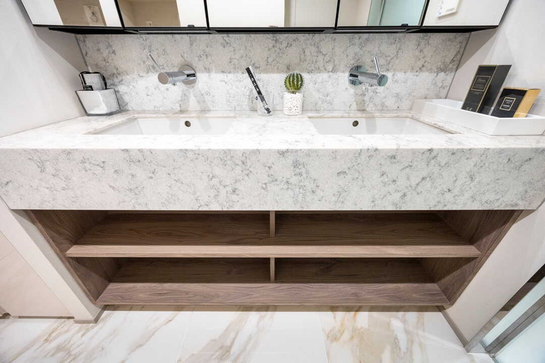 ホテルライクな2ボウル洗面の化粧台です。忙しい朝でも並んで支度ができて便利。また、大きなミラーボックスの中には化粧品などが収納できて使い勝手が良好です。さらに、横には棚が造られているので、ごちゃごちゃしがちな洗面まわりも整頓させることができますよ。