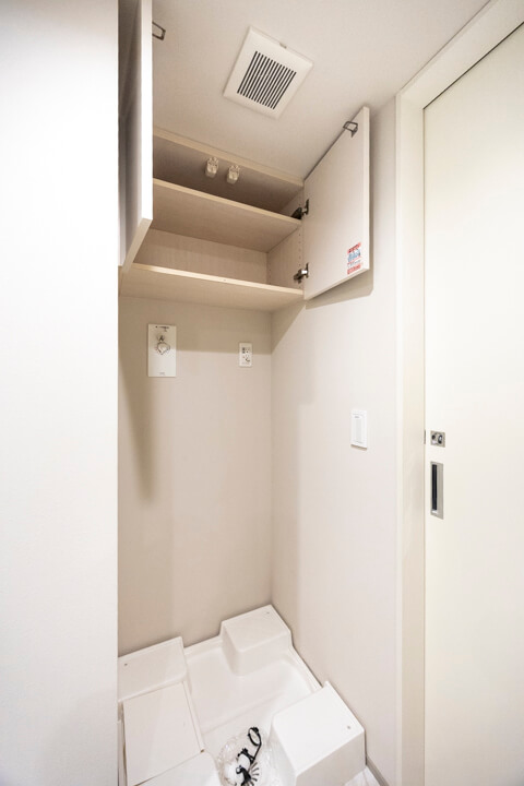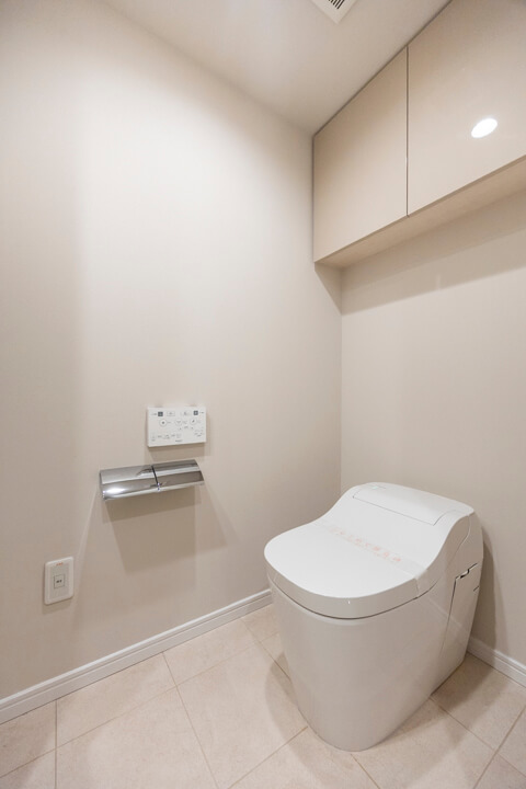 ウォシュレット一体型のトイレです。タンクレスタイプなのですっきりとした印象に。また、別途で手洗い器と鏡が造られているので、その場でサッと身だしなみを整えることができます。上部には吊戸棚が設置されていて、収納スペースもありますよ。