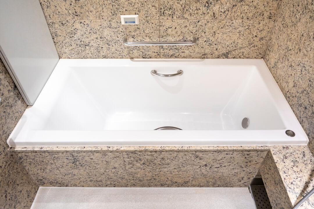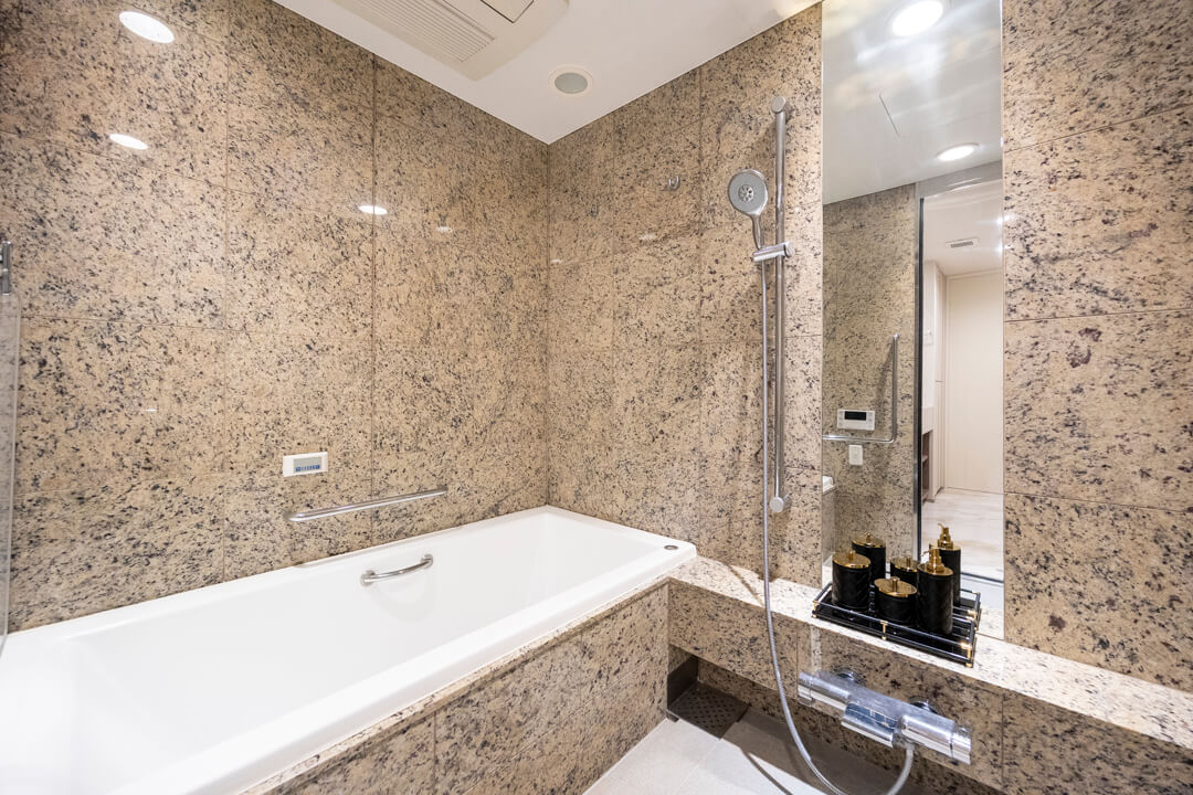 石目調でまとめられた重厚感のあるバスルームです。お風呂にゆっくり浸かるのが好きという方に嬉しい追い焚き機能を搭載。家族の入浴時間がずれてしまっても安心です。また、浴室乾燥機には暖房・乾燥・換気・涼風の機能がついており、一年中快適に過ごすことができます。