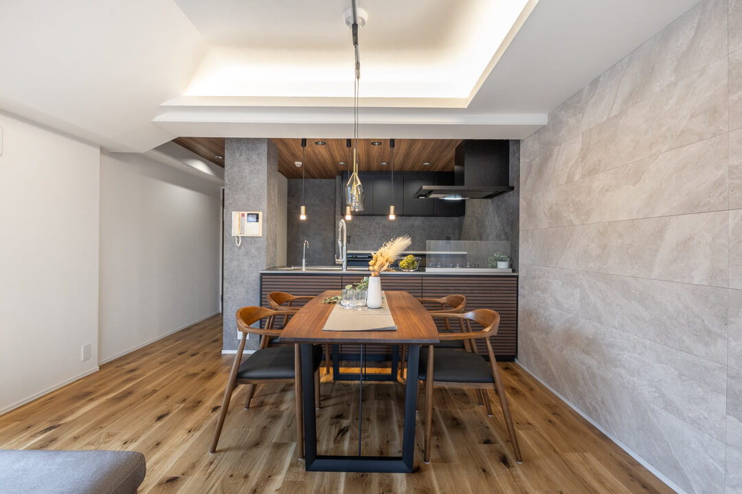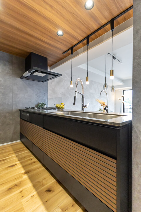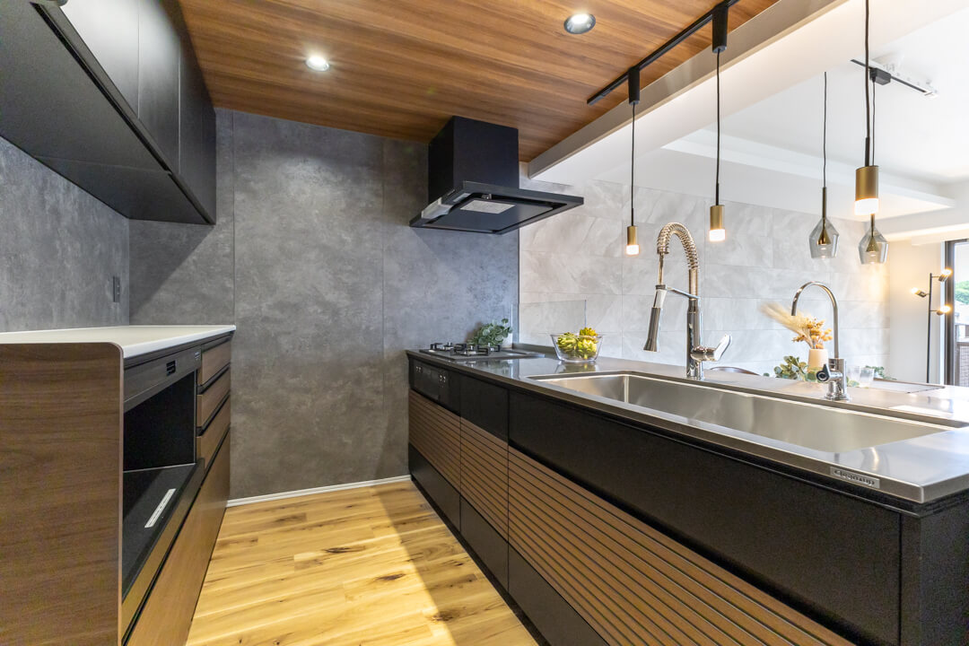 リビングダイニングを見渡せる人気の対面キッチン。開放的な気分で調理ができ、家族のコミュニケーションも増えそうです。モルタル調の壁や木目天井が高級感を演出します。