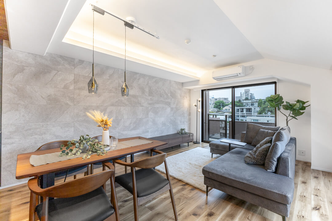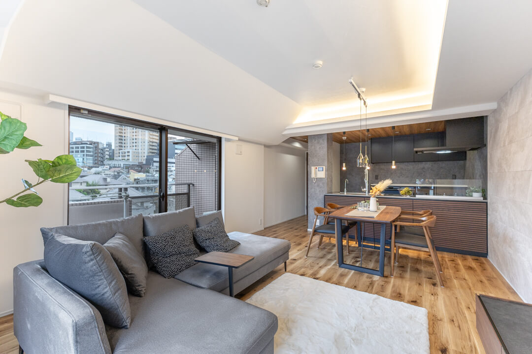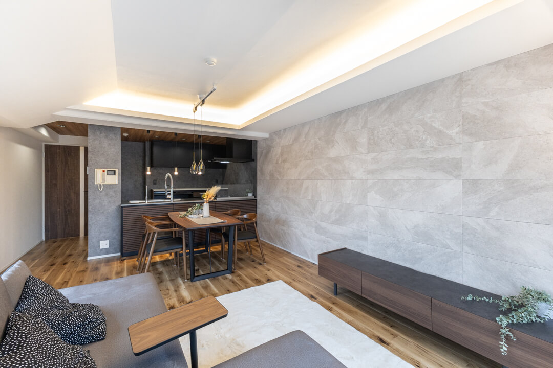 約17.2帖のLDK。2面バルコニーで、明るく開放感溢れる空間です。風通しの良さも魅力的ですね。木の質感を感じるフローリングと石目柄ウォールの相性は◎。木のぬくもりとモダンな雰囲気を兼ね備えたお洒落な内装です。折り上げ天井には間接照明が施され、やわらかな明かりがリラックスタイムへ誘ってくれそうです。