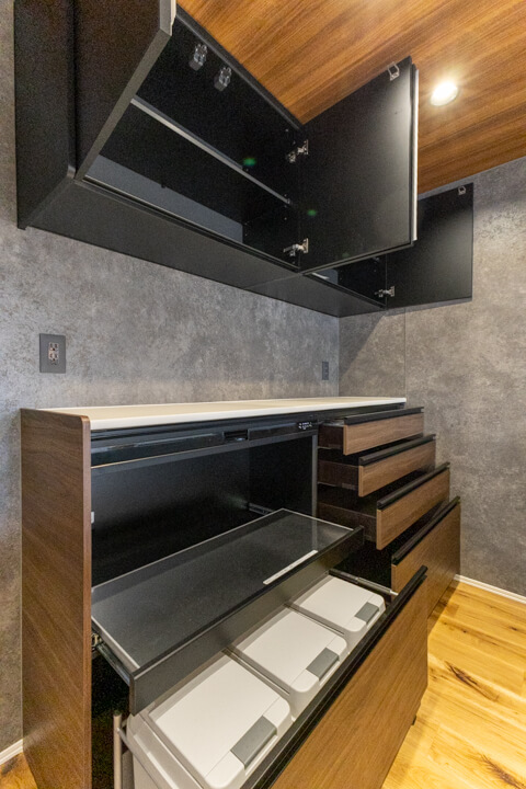 カップボード完備で収納力も◎。食料品のストックや食器類を整理整頓でき、いつも清潔なキッチン空間をキープできそうです。蒸気排出ユニット付きで、炊飯器を収納したままご飯を炊いたり、お湯を沸かすことができるのも嬉しいポイント。下にはワゴン式のダストボックスがあり、生活感が出る部分をさりげなくカバーできます。