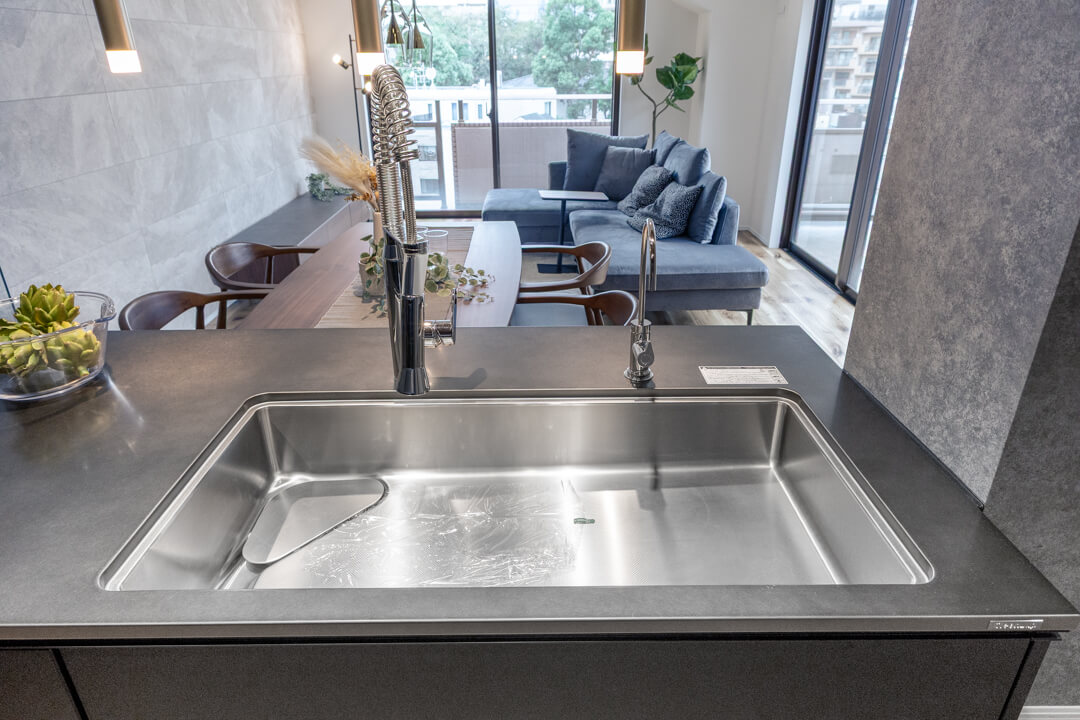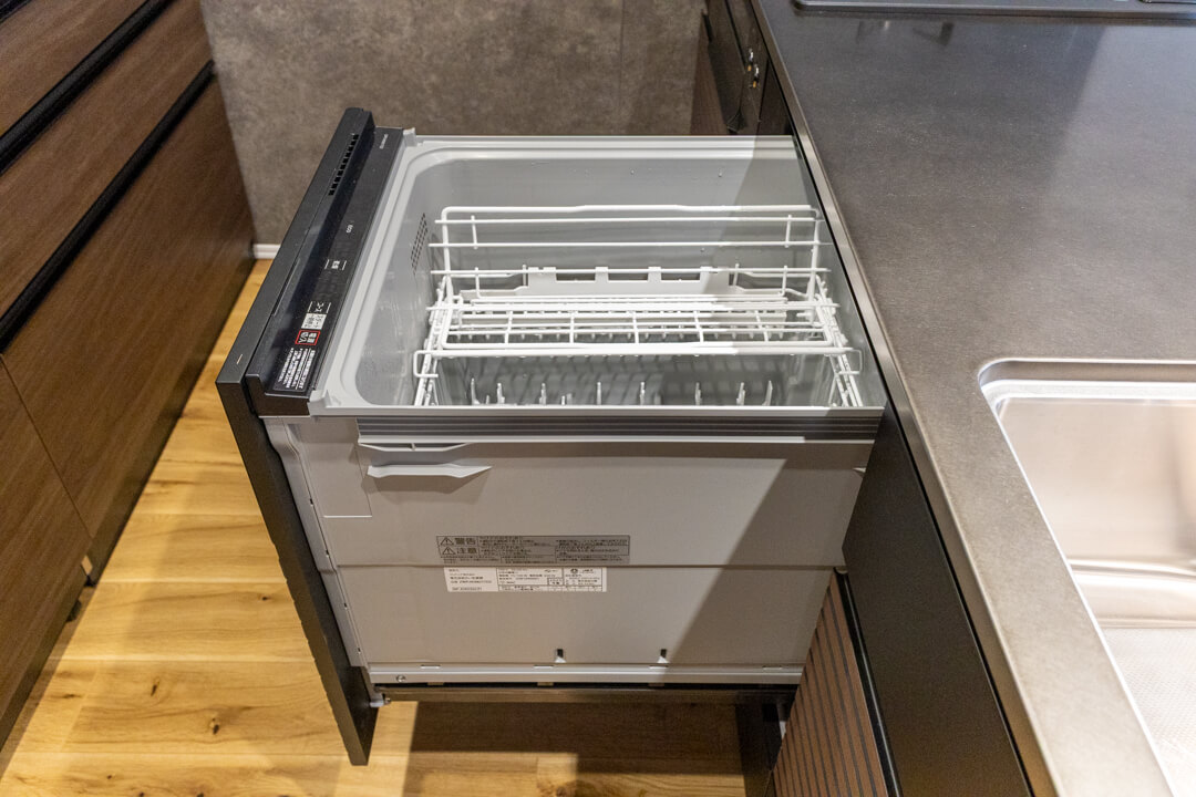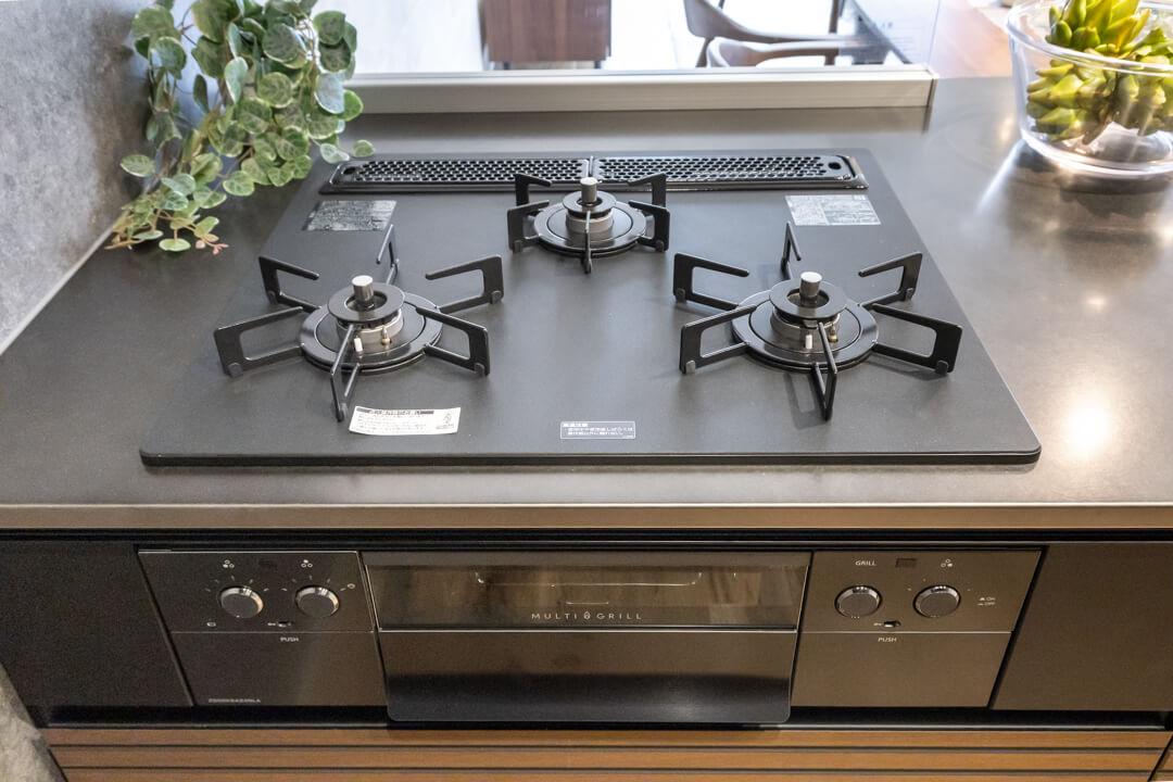 効率良く調理ができるグリル付3口ガスコンロを搭載。料理のレパートリーも増えそうです。さらに、食洗機が内蔵されているので、後片付けが捗り、節水効果も期待できます。