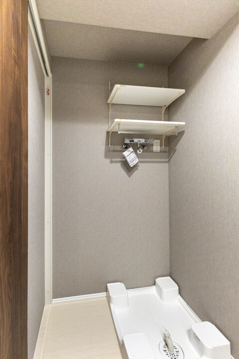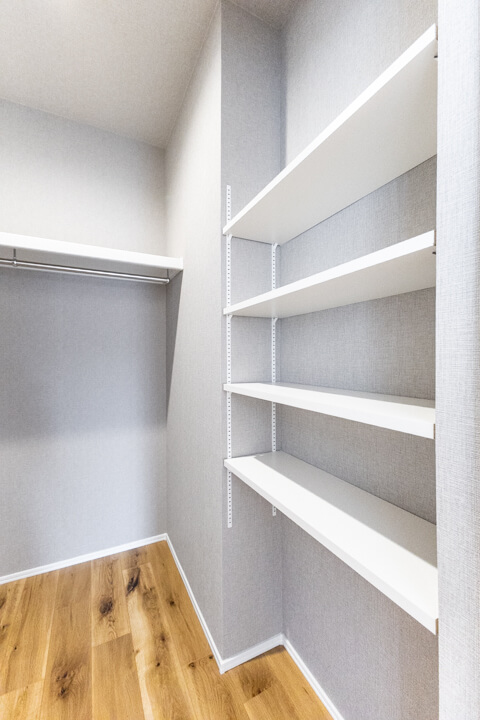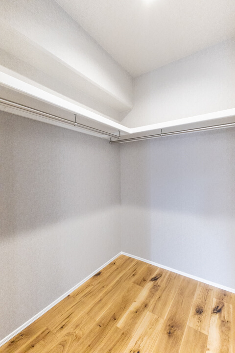 WIC(ウォークインクローゼット)完備で収納力◎。ハンガーパイプ&可動棚備え付けで荷物を整理整頓しやすいです。トランクケースやゴルフバッグといった大きな荷物も収納でき、居室空間を広々と使うことができます。