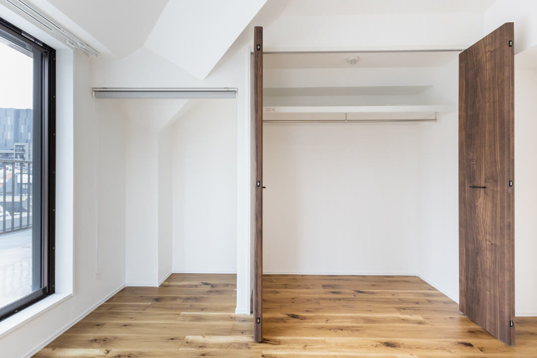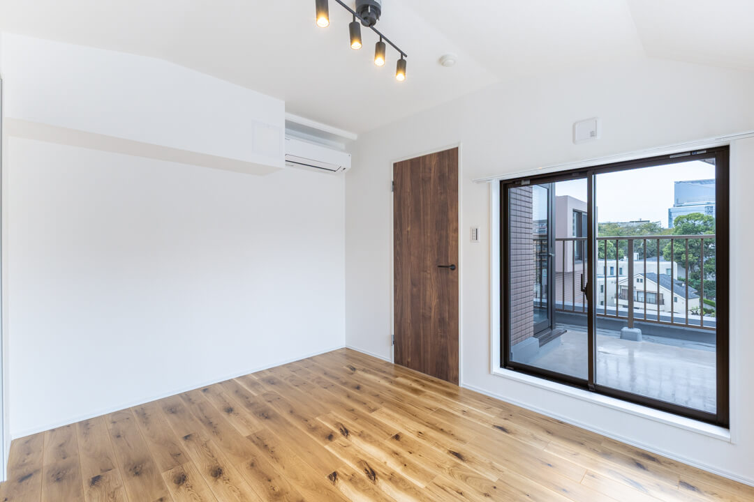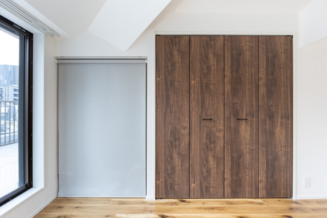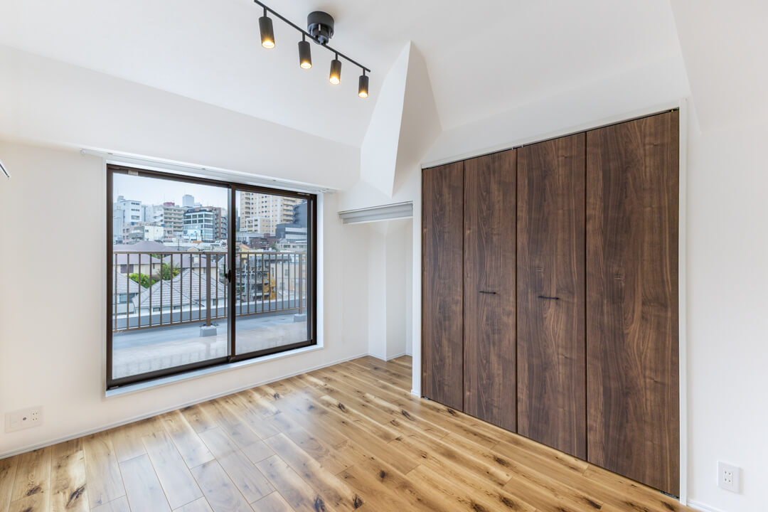 約6.9帖の洋室2。2つのルーフテラスに接続していて、奥行きを感じる空間です。オープンクローゼット&4枚折れ戸のクローゼット完備で収納スペースもしっかり確保◎。オープンクローゼットにはロールスクリーンが付いていて、さっと目隠しできるのもポイントです。