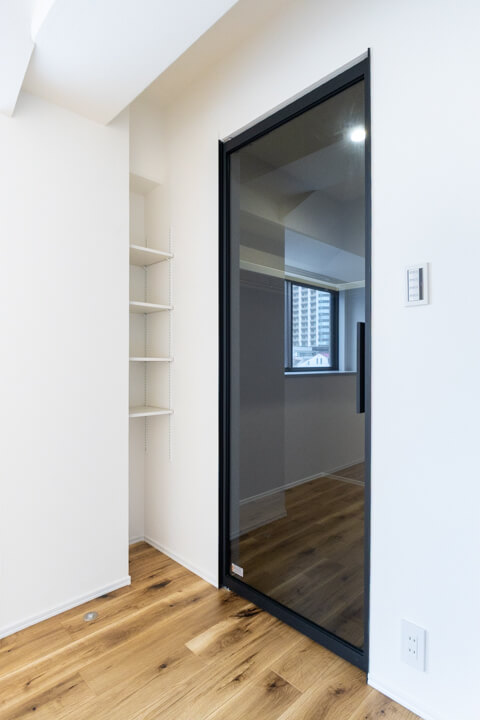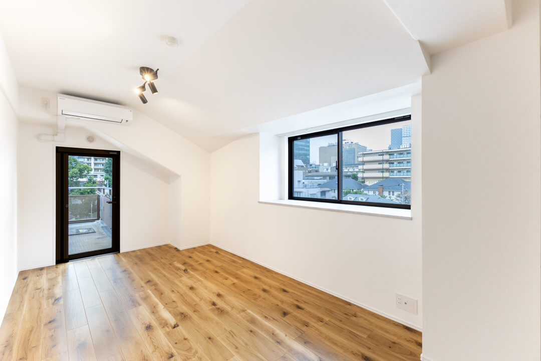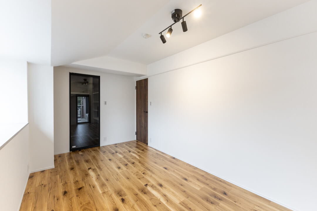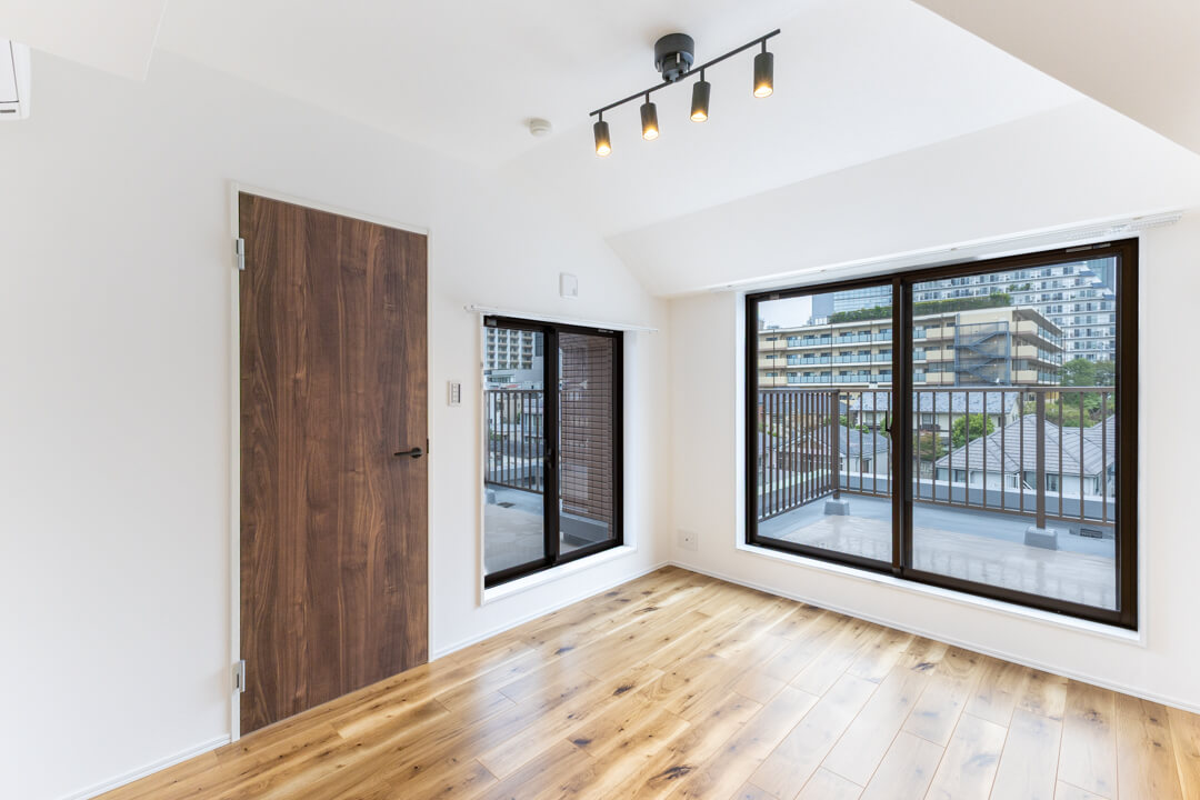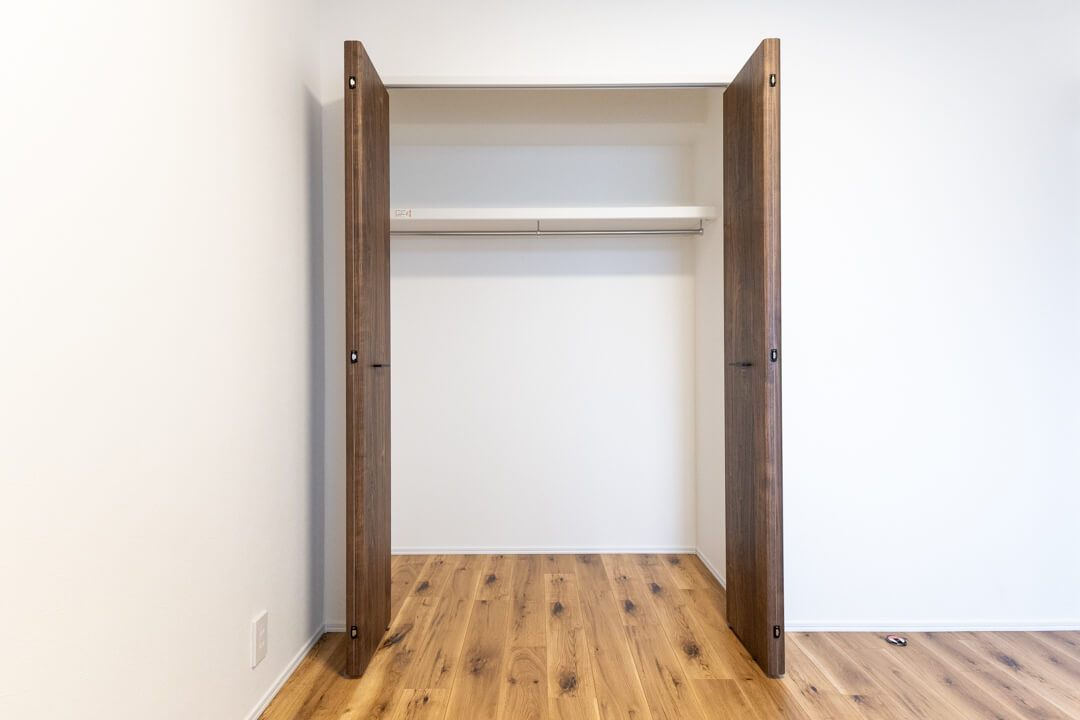 約6.9帖の洋室2。2つのルーフテラスに接続していて、奥行きを感じる空間です。オープンクローゼット&4枚折れ戸のクローゼット完備で収納スペースもしっかり確保◎。オープンクローゼットにはロールスクリーンが付いていて、さっと目隠しできるのもポイントです。
