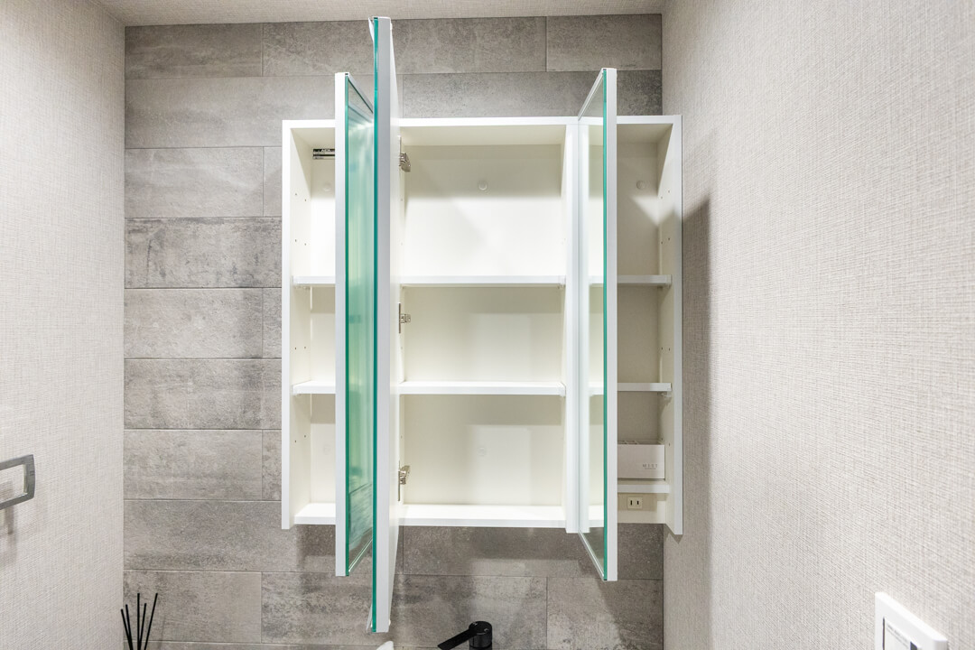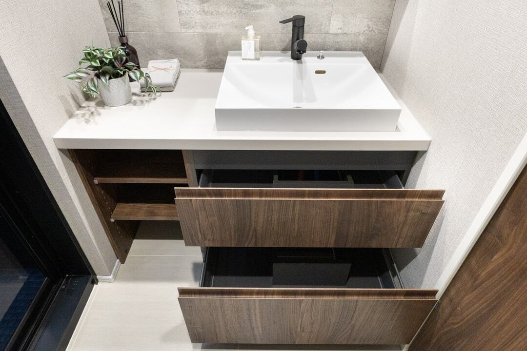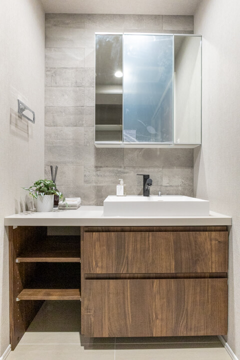石調のアクセントウォールと木目扉のコントラストが美しく、モダンな雰囲気の洗面室。三面鏡付きの洗面化粧台は使い勝手良好です。カウンタースペースにゆとりがあり、化粧品やドライヤーの仮置きができるのも嬉しいポイントです。ミラーボックス・引き出し・可動棚付きで散らかりがちな洗面まわりがすっきり片付きそうですね。