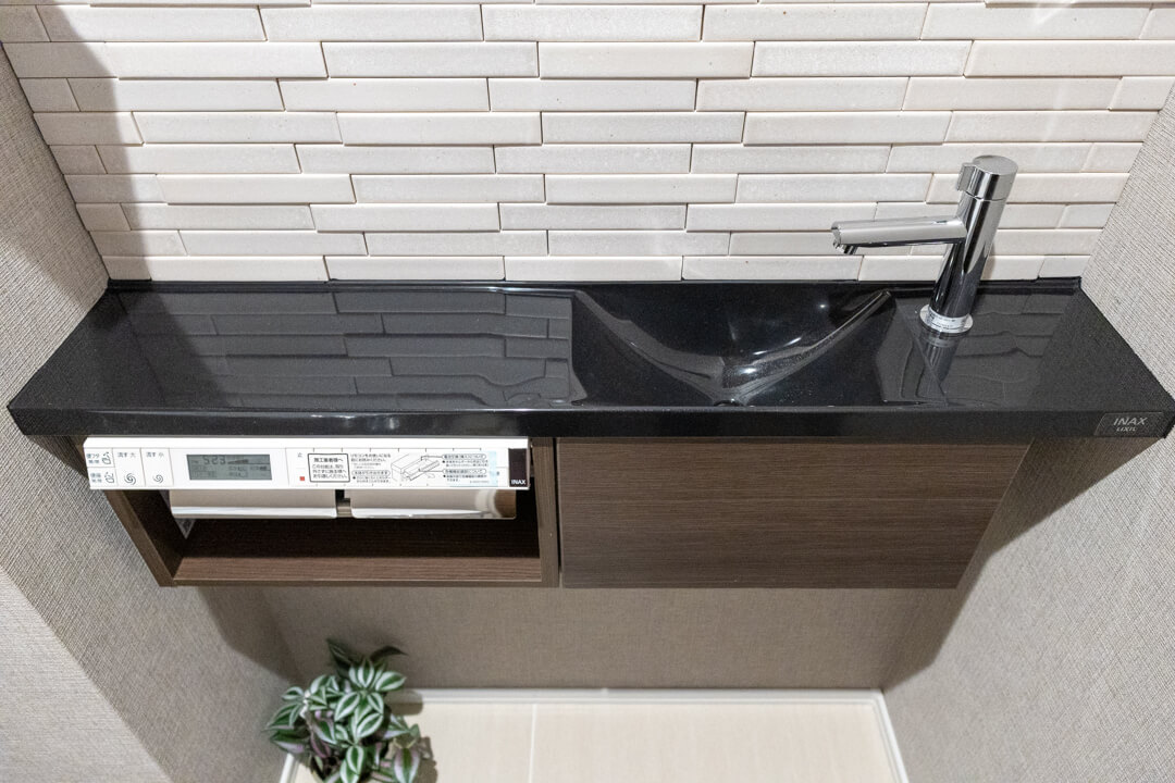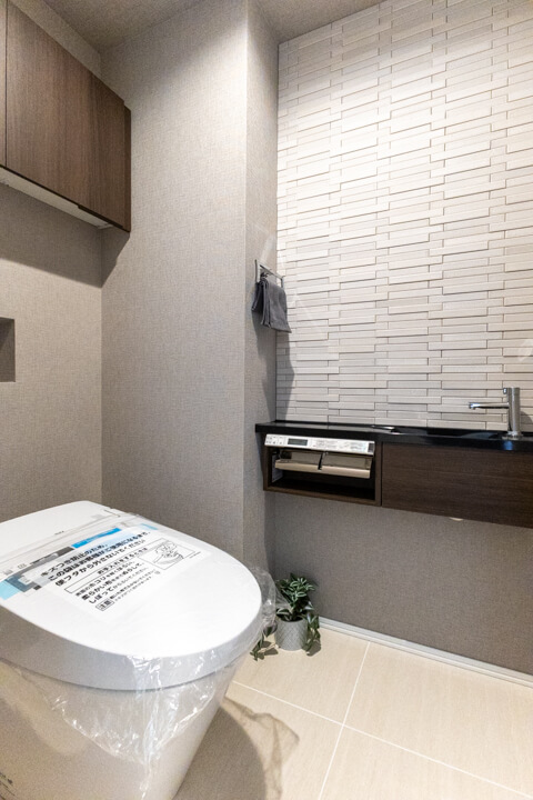 廊下に面していて独立性の高いレストルーム。LIXIL製の洗浄機能付トイレに交換済みです。アクセントウォールが洗練された雰囲気を演出。手洗いカウンター付きなので、すぐに手を洗うことができて衛生的です。トイレットペーパーや掃除用品の収納に便利な吊戸棚も完備しています。