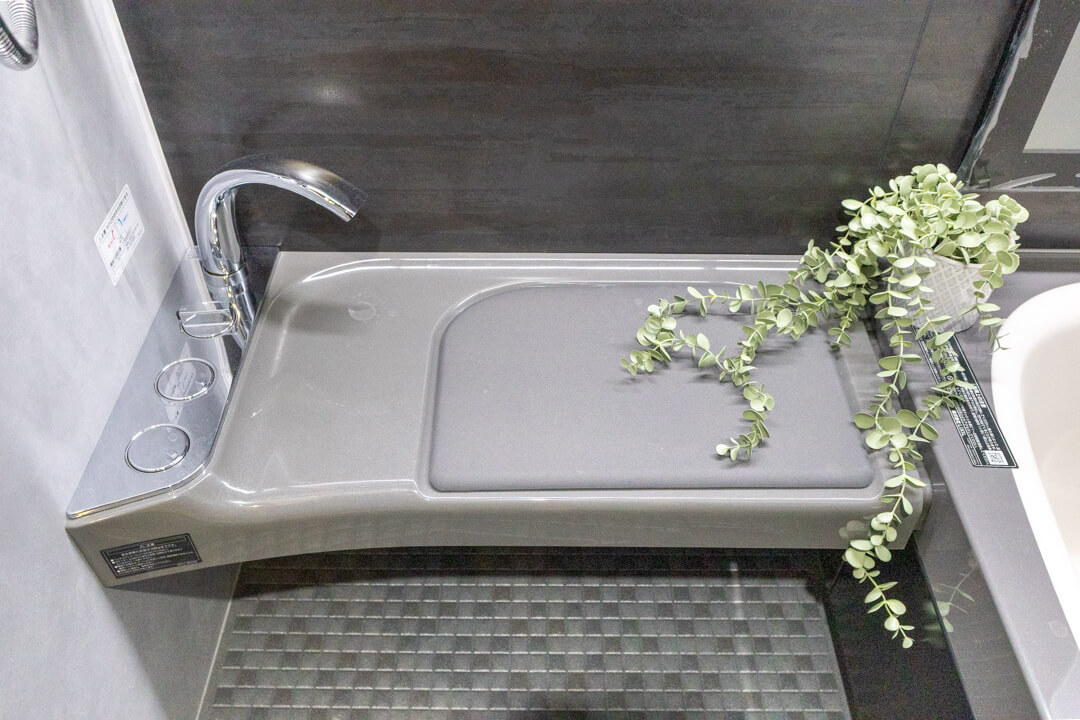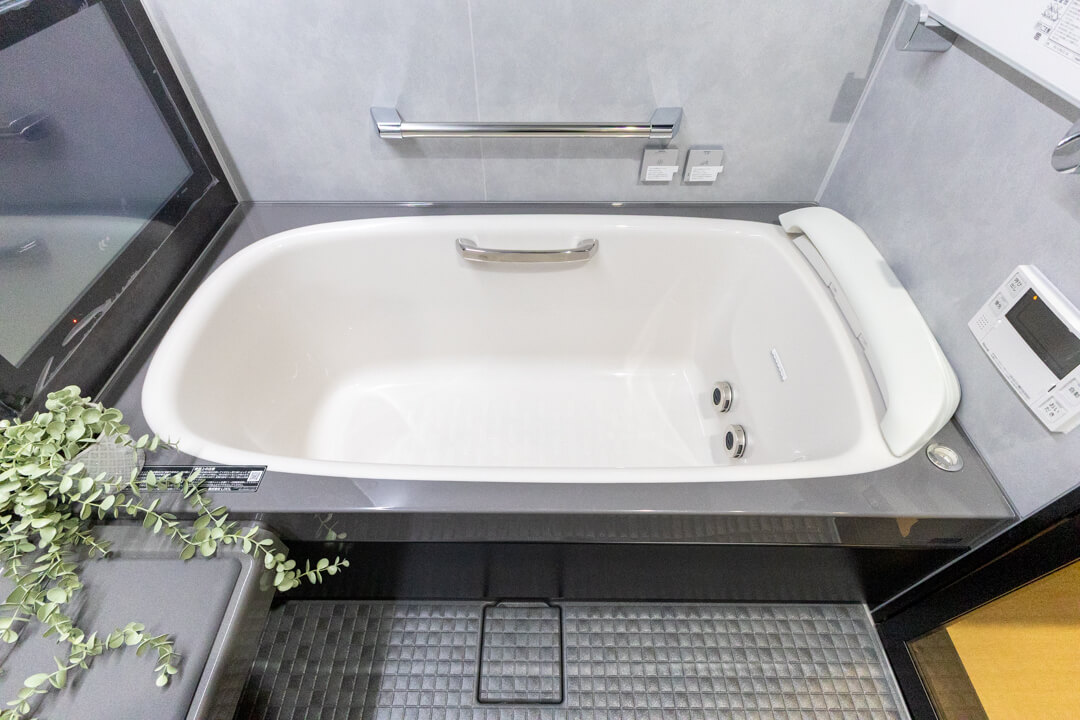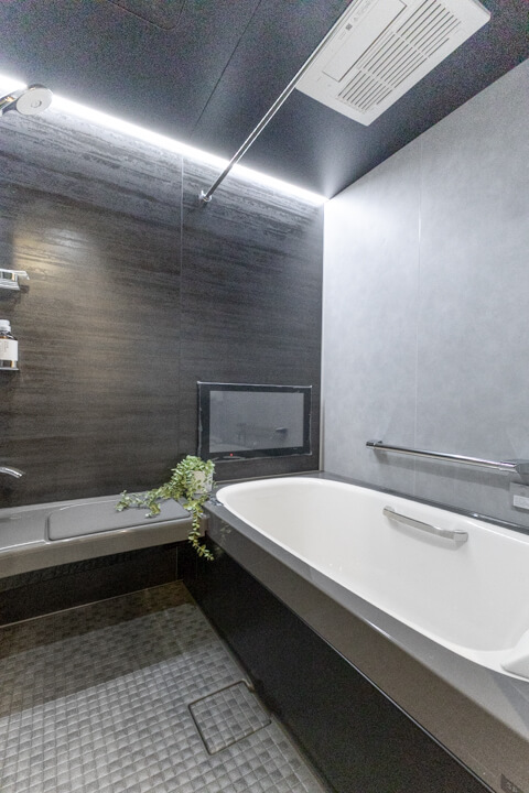 モノトーン調でスタイリッシュなバスルーム。浴槽にはお湯を照らすアクアフィールライトが搭載されていて、スパのようなリラックスタイムを過ごせます。肌をなでるお湯がやさしく身体をあたためてくれる「肩湯」に、心地よい刺激で腰まわりをほぐしてくれる「腰ほぐし湯」。日々の疲れを癒してくれる極上の時間になりそうですね。フットバスや打たせ湯を楽しむのに便利なベンチカウンター、浴室テレビも設置されています。