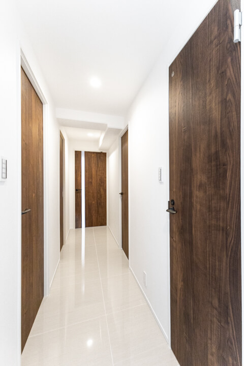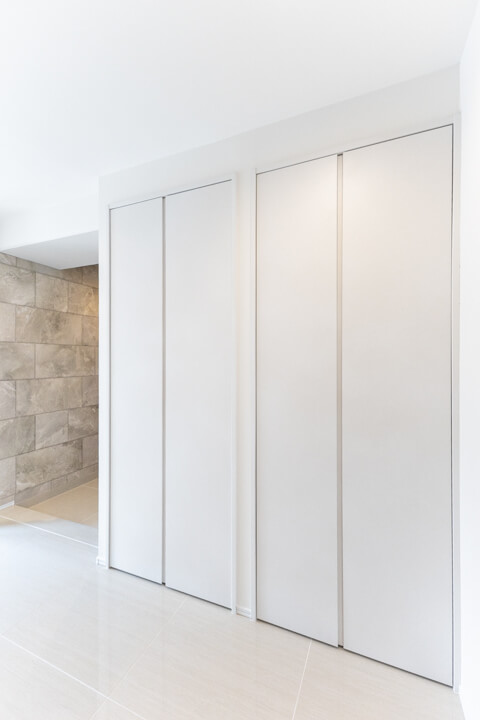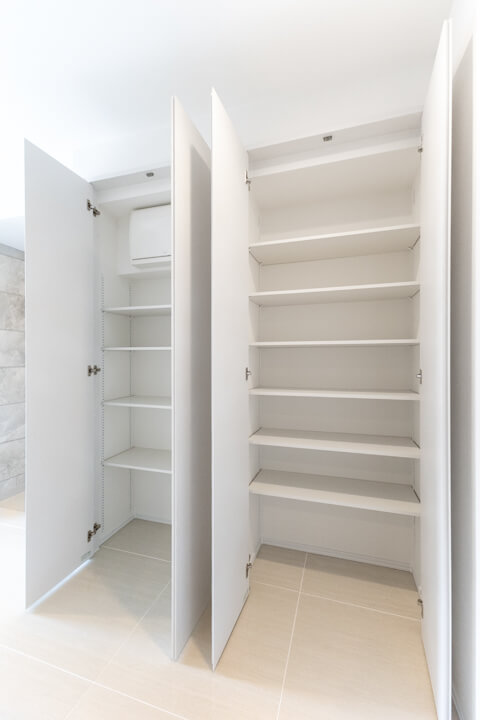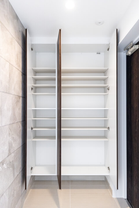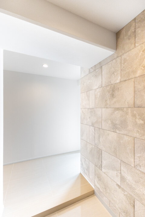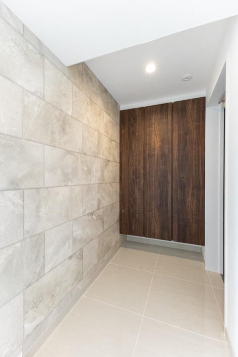石目柄のアクセントウォールが高級感を演出する玄関。人感センサー付照明が設置されていて、夜遅く帰宅しても明るく出迎えてくれます。散らかりがちな靴は、シューズボックスにすっきり収納◎。日用品ストックやアウトドアグッズの収納に便利な物入も完備しています。突き当たりにはルーフテラスがあり、明るい自然光が差し込みます。