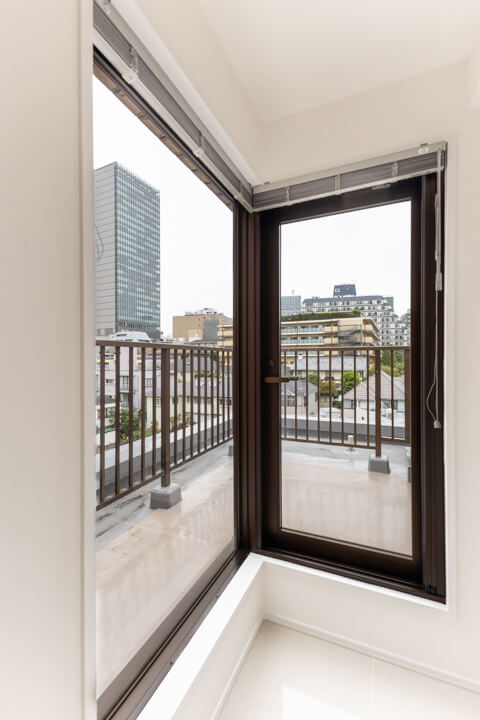 LDKに接続する2つのバルコニー。合計11.65㎡の広さです。北西側のバルコニーへは、洋室1からも出入りできますよ。明るい光と心地よい風を室内に届けてくれますね。周辺には住宅やマンションが多いですが、木々の緑も見えて穏やかな見晴らしです。