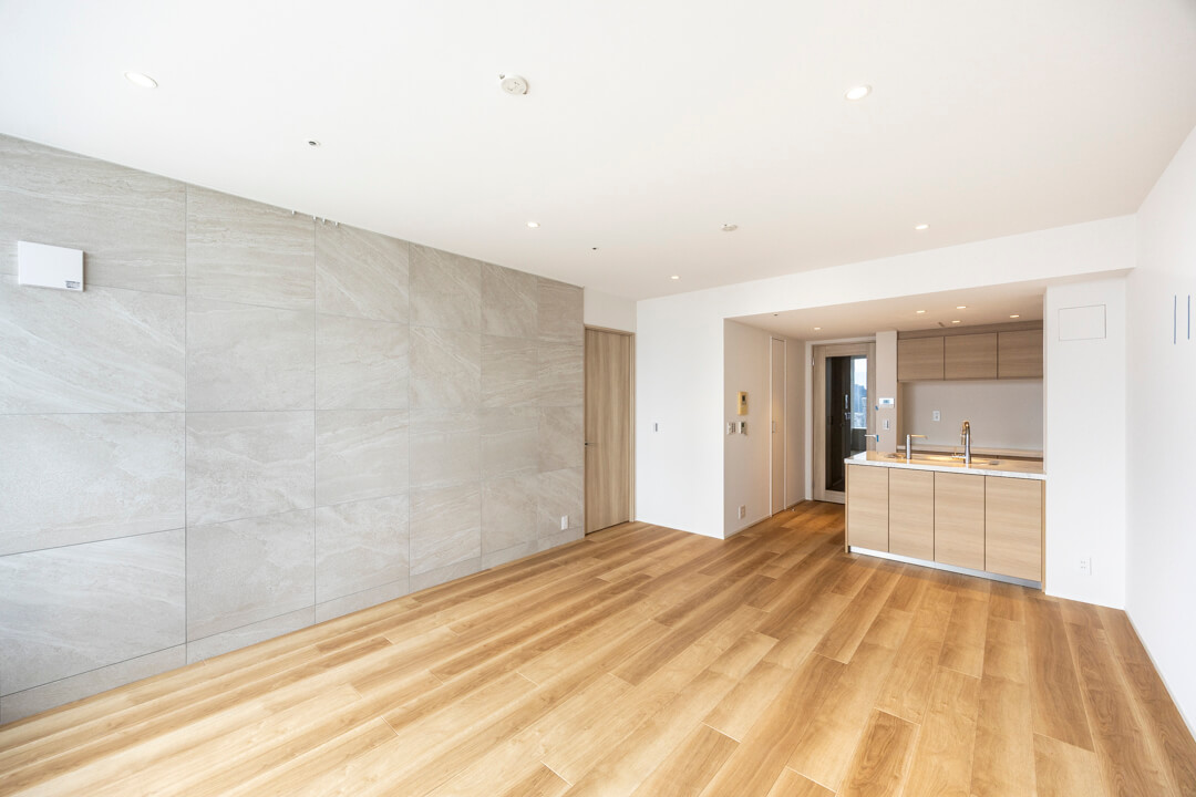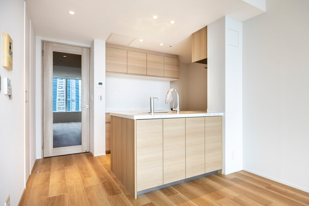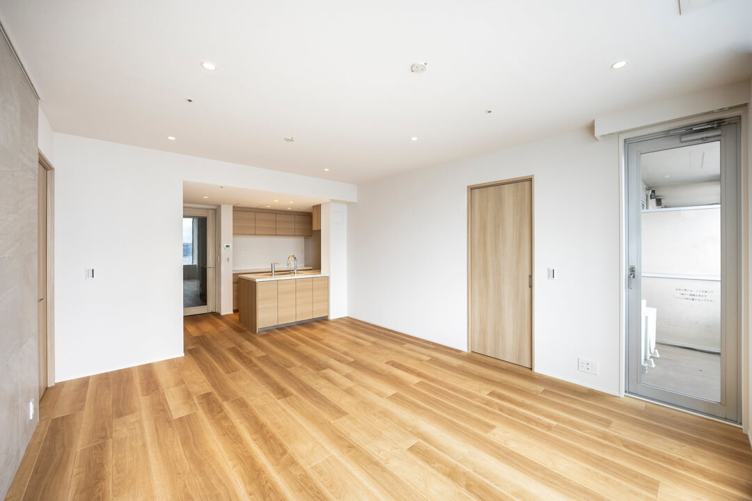 約19.1帖の広々としたリビングダイニングキッチンです。南西向きのため日当たりが良好、大きな窓からはレインボーブリッジや東京タワーを望む開放的な眺望が広がっています。窓際にあるカウンターには小物やグリーンを置いても◎。