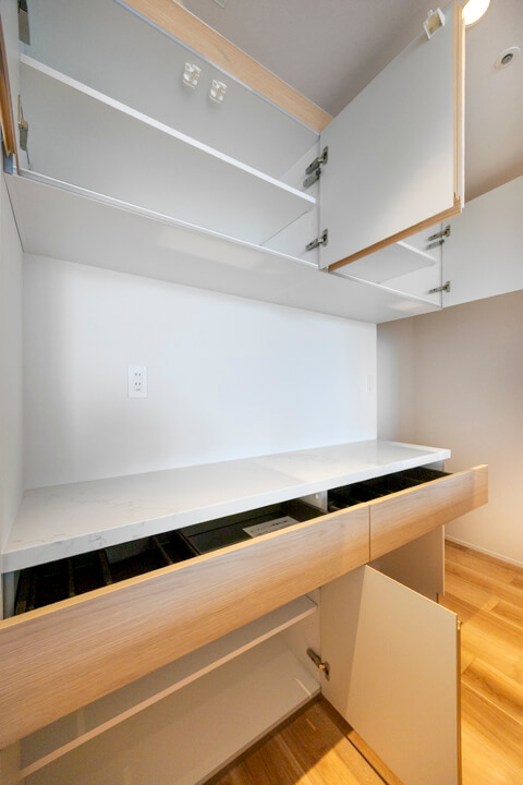 キッチンの背面側にはカップボードが備え付けられています。調味料や食器などを収納できるだけでなく、電子レンジなどを置くこともできるので便利です。