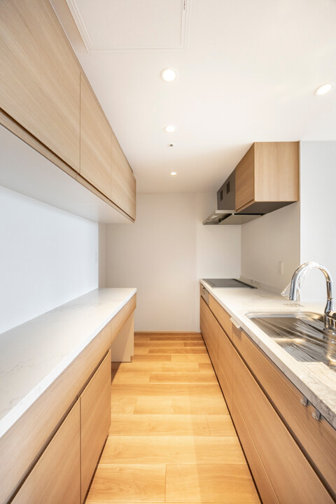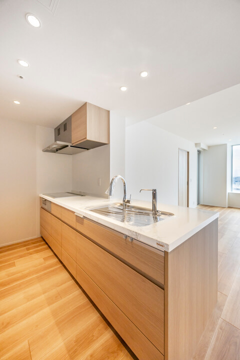 キッチンは、リビングダイニングを見渡しながら料理ができる対面式です。家族や来客とのコミュニケーションが取りやすくて◎。しかし、コンロ側には壁がたっているので、油跳ねなどの心配はありません。