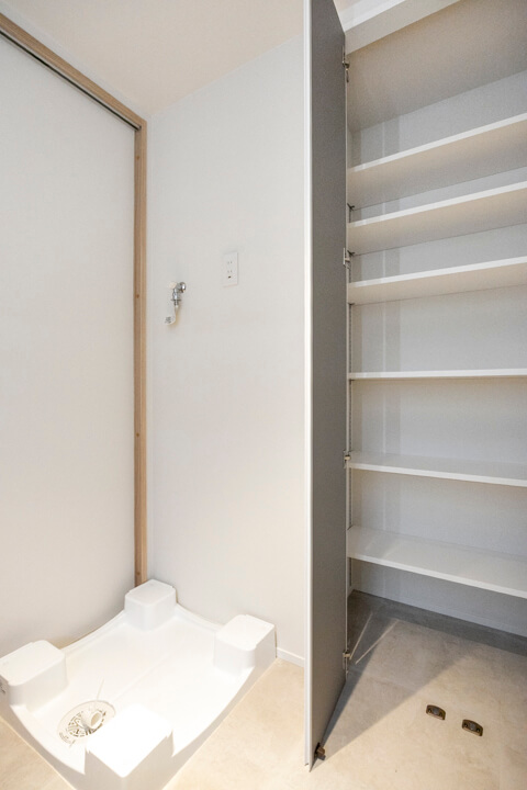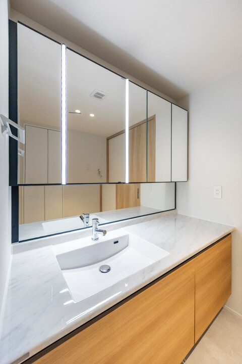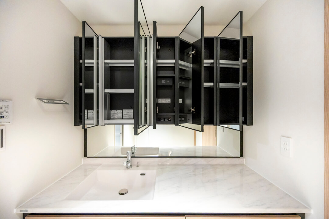 LIXIL製の洗面化粧台は、ブラックフレームがアクセントになっていてデザイン性が◎。三面鏡は中に化粧品などの小物が収納できるようになっているので使い勝手良好です。タッチレススイッチで照明が縦に配置されているので、顔に影をつくりません。カウンターが広めなのも使いやすくて嬉しいですね。また、洗面ボウルとカウンターが一体型になっているのでお掃除が簡単です。さらに、背面側にはリネン庫が造られています。