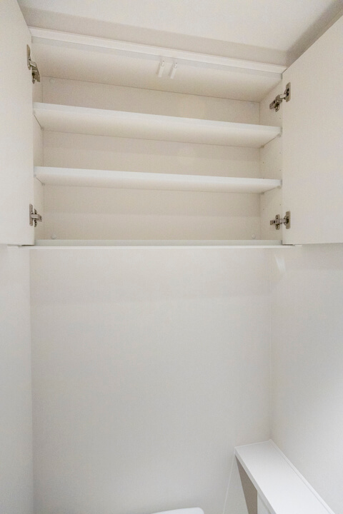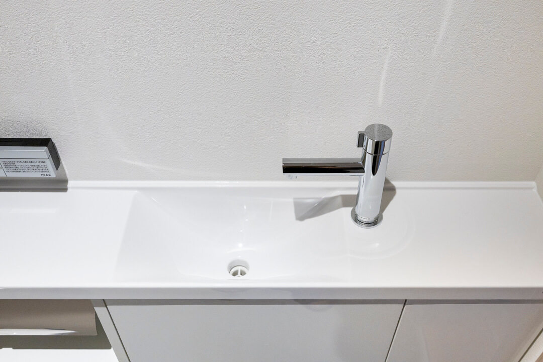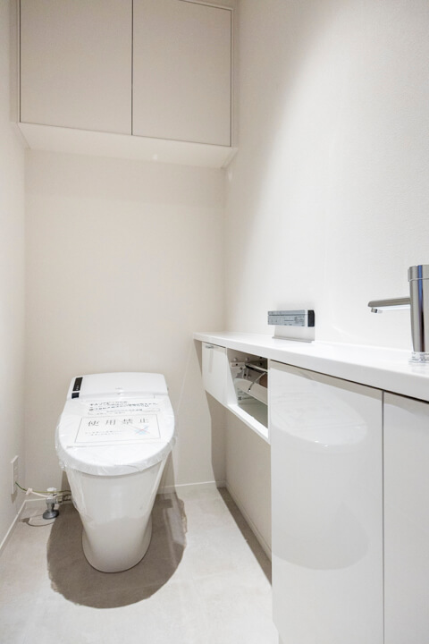LIXIL製のウォシュレット一体型のトイレです。タンクレスタイプなのですっきりとした印象に。また、別途で手洗い器が造られているので、すぐに手を洗うことができて衛生的です。上部には吊戸棚が設置されていて、収納スペースもありますよ。カウンタースペースにはアロマなどを置いても◎。