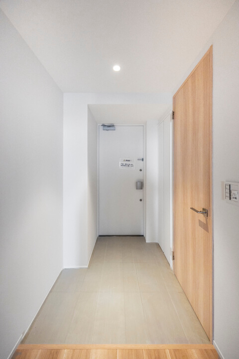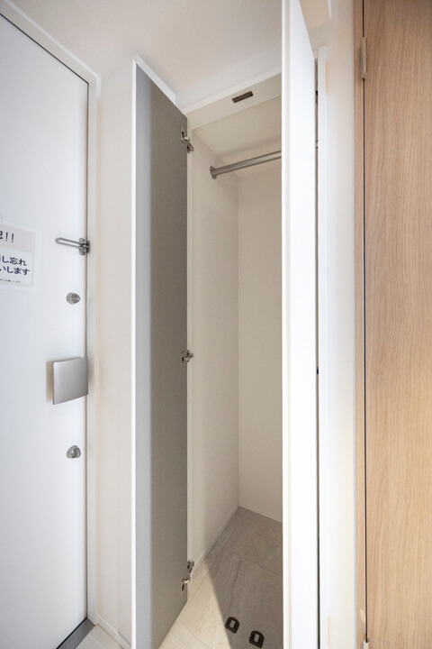 白を基調とした清潔感のある玄関です。約1.1帖のシューズインクローゼット付きで、たくさんの靴を収納することができますよ。さらに、ゴルフバッグなども収納できそうなスペースも造られています。