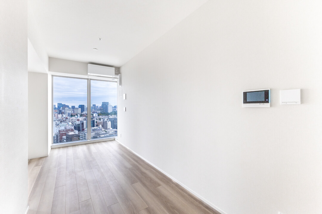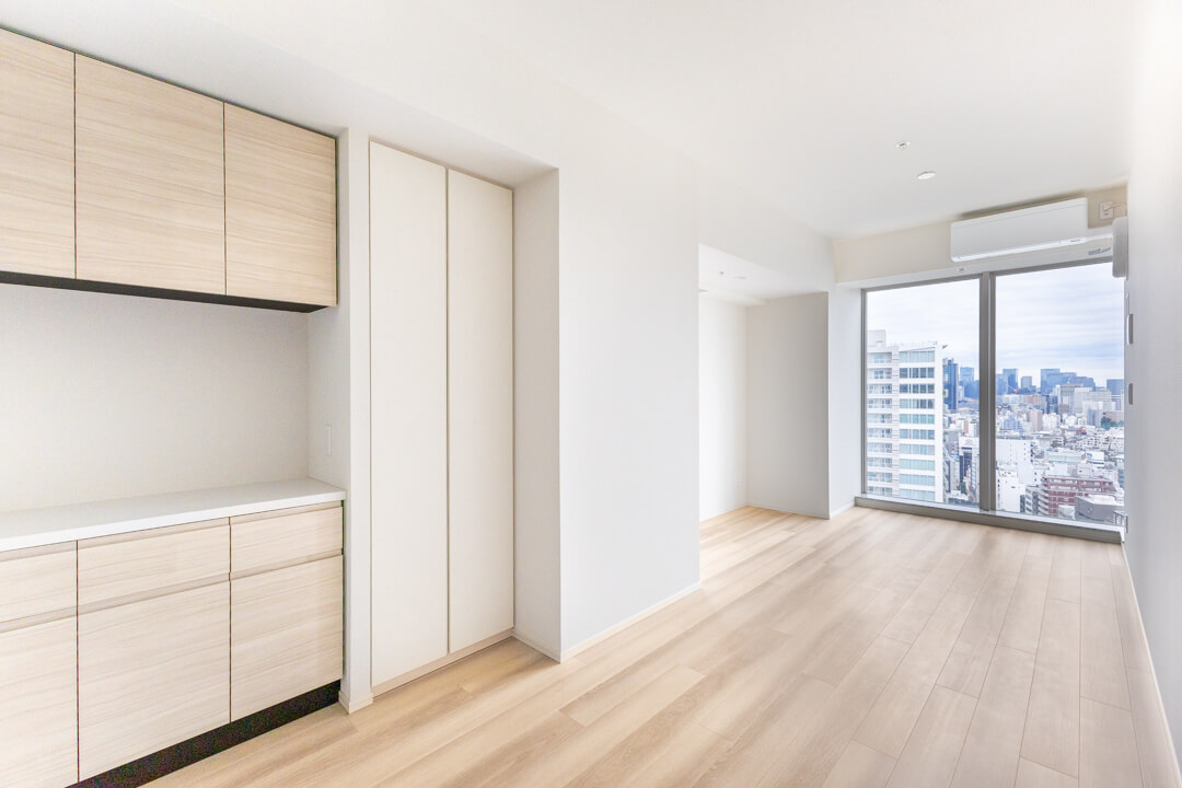 約12.0帖のリビングダイニング。開放的な景色が望める大きな窓が魅力のひとつ。24階部につき、都心のビル群と赤坂御所の緑が望めます。キッチンとリビングダイニングが空間分けされていて、生活感を感じさせないすっきりしたリビングダイニング。カップボードと物入が並んで設置されていて、収納スペースも備わっています。