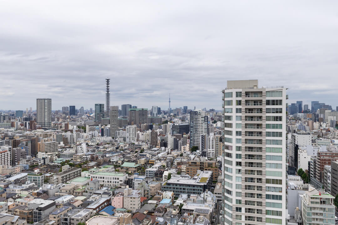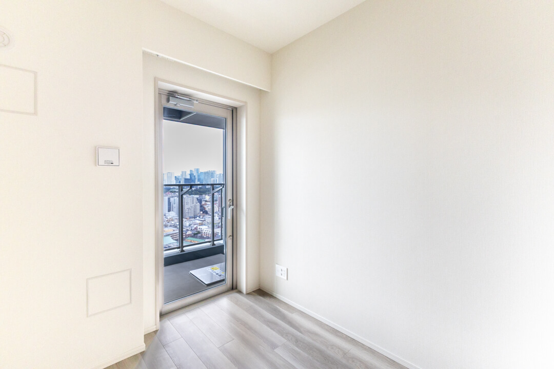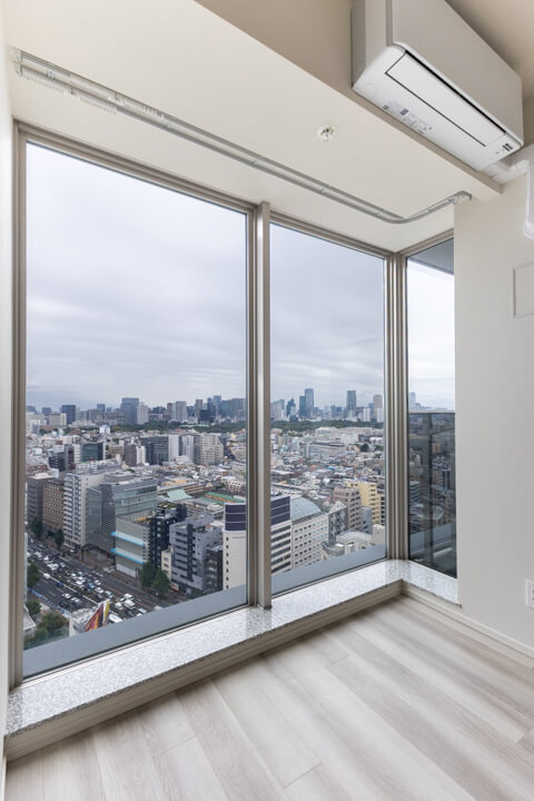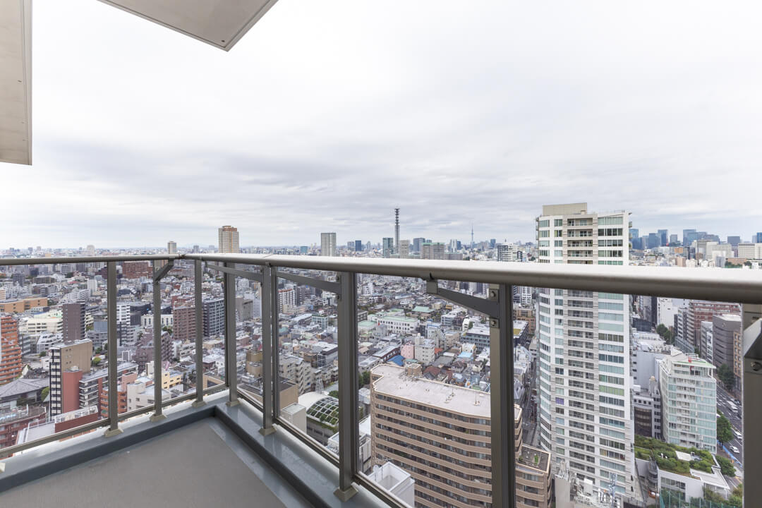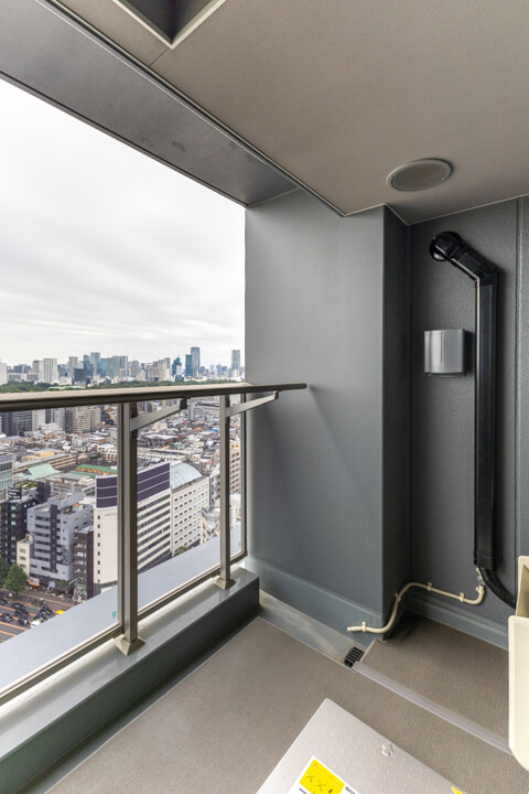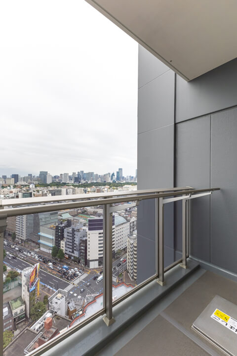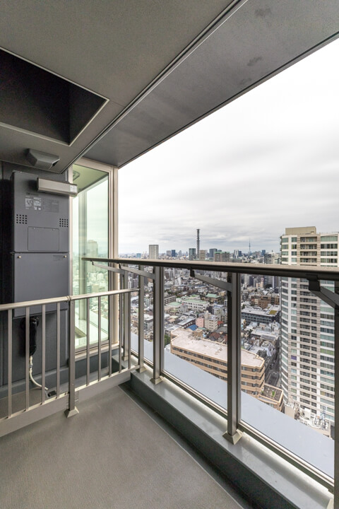 バルコニーはリビングと洋室の2ヵ所に付いています。計12.65㎡で、どちらも朝の光が心地よい東向き。手すりが透明になっており、景色を遮らず開放感もよりUP。24階部につき、都心のビル群が見渡せます。天候によっては東京スカイツリーも望めます。