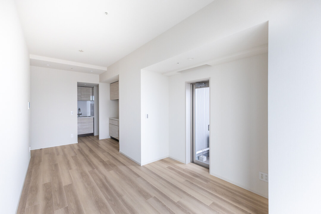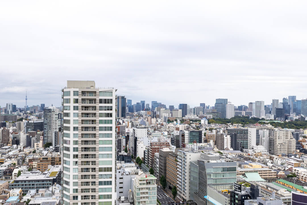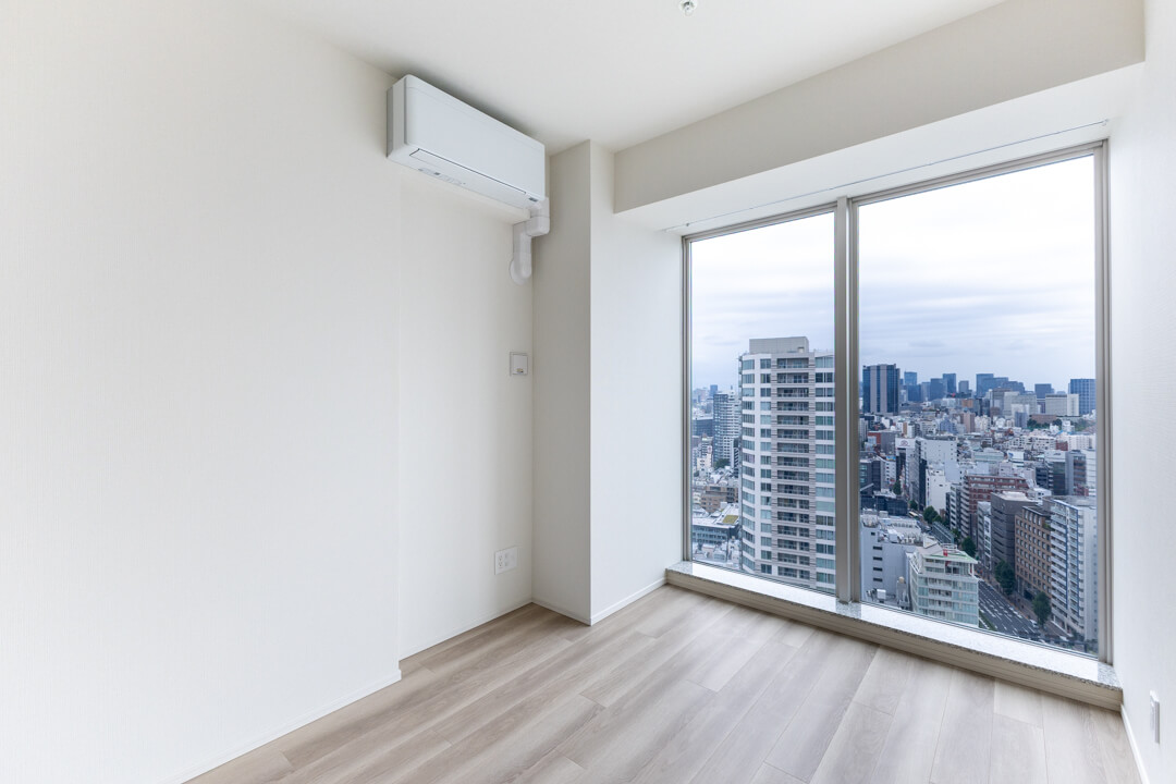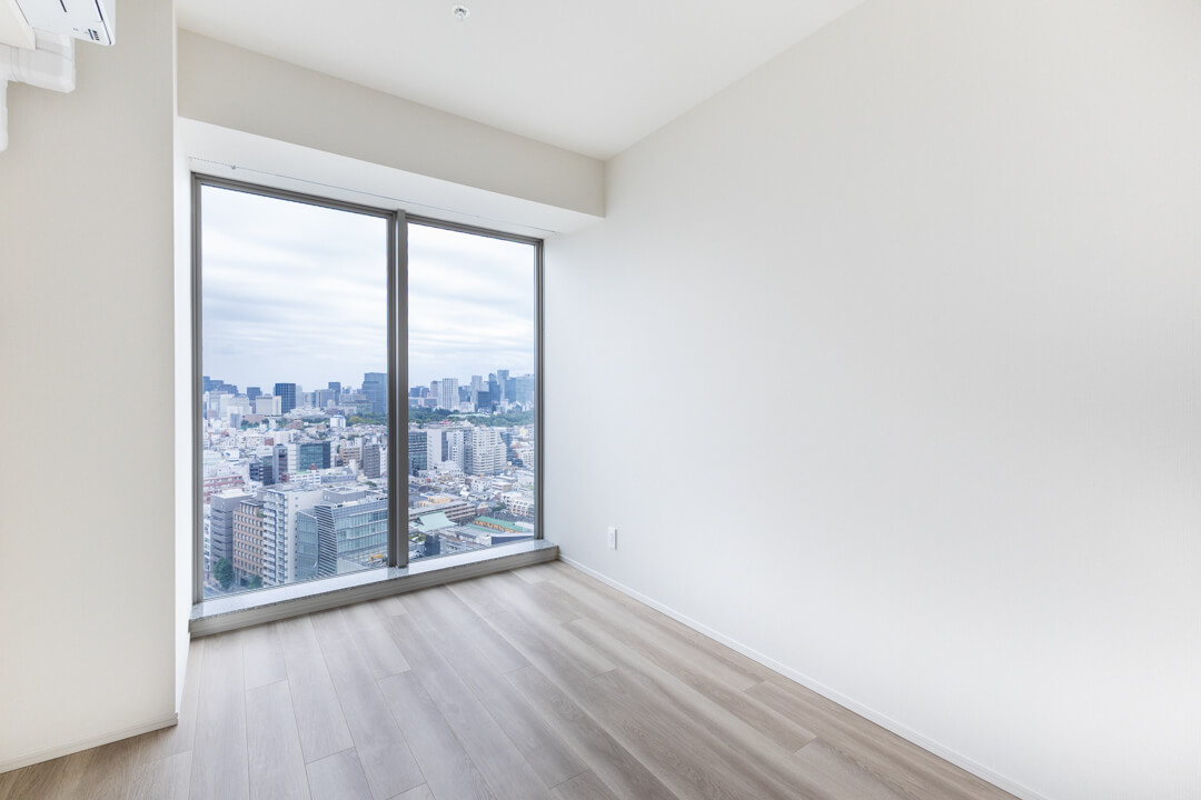 バルコニーはリビングと洋室の2ヵ所に付いています。計12.65㎡で、どちらも朝の光が心地よい東向き。手すりが透明になっており、景色を遮らず開放感もよりUP。24階部につき、都心のビル群が見渡せます。天候によっては東京スカイツリーも望めます。