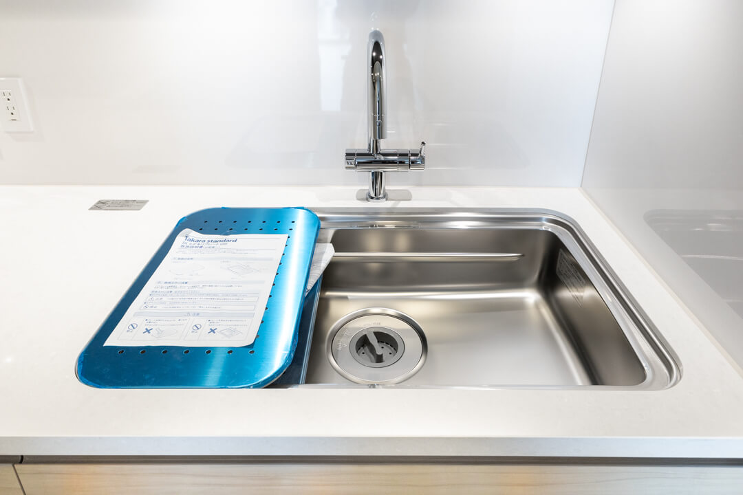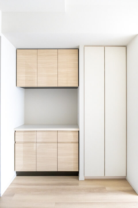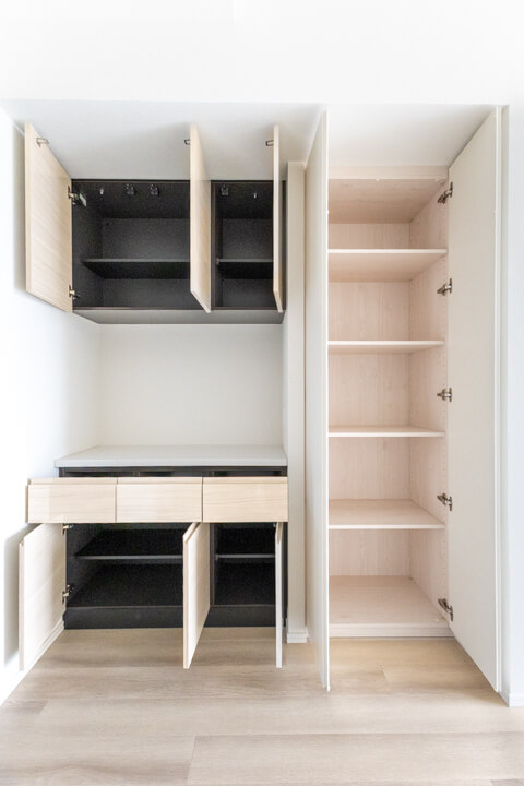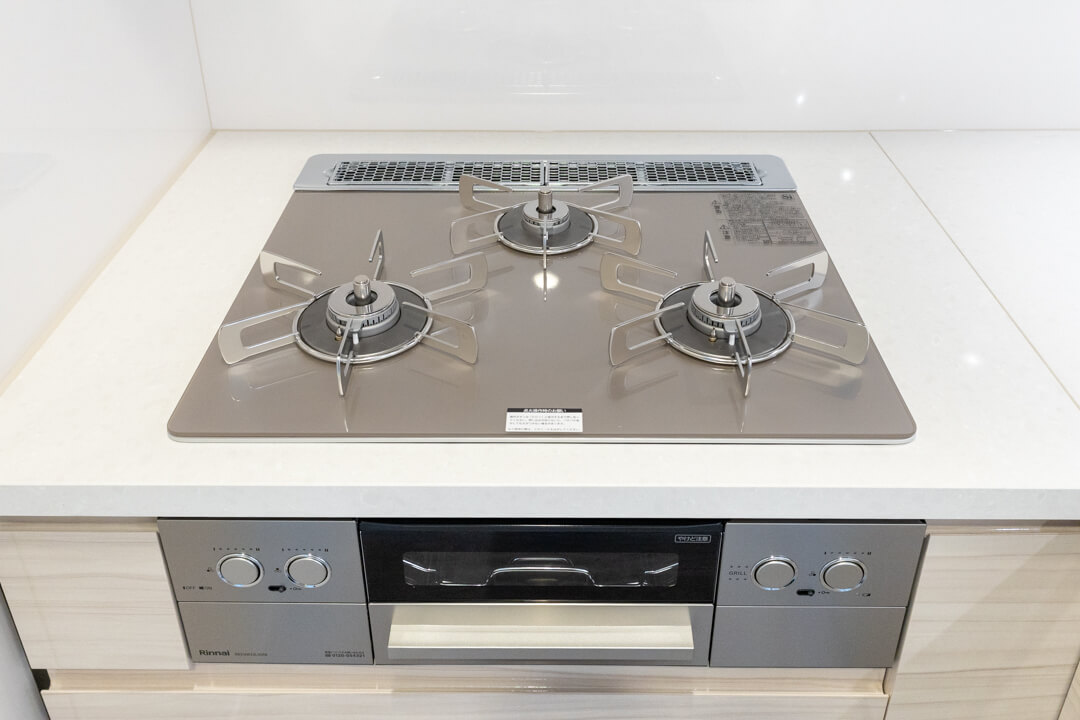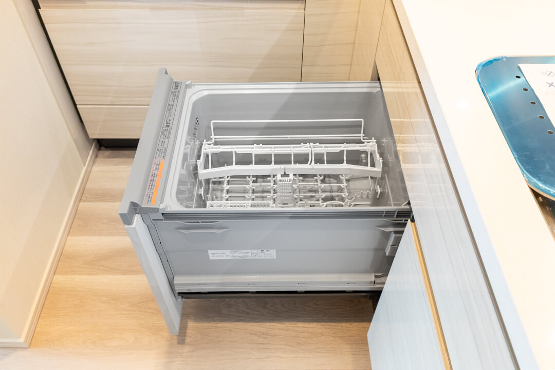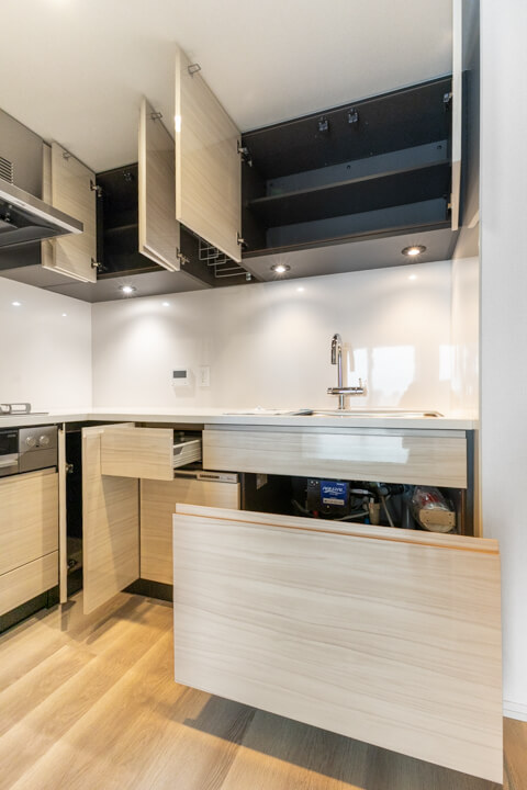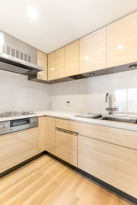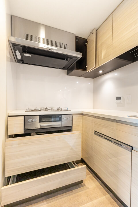 約3.3帖のキッチンスペース。リビングダイニングと空間分けされた独立型のキッチンで、キッチンまわりの生活感をさりげなく目隠しできます。料理が捗る3口ガスコンロ、家事の時短に心強い食洗機、生ごみの処理に便利なディスポーザー付で設備も充実。モノの出し入れがしやすい引き出し式のキャビネット付きで使い勝手の良さもポイントです。