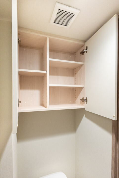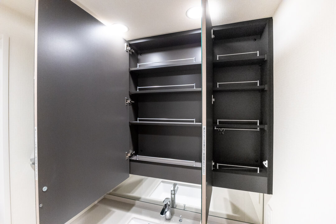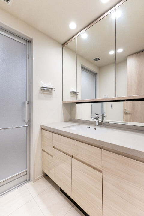 洗面化粧台は洗面まわりの小物がすっきり整頓できるミラーボックス付きでいつでも整った状態をキープできそうです。洗面下収納に加え、別途リネン庫も備わっており収納が充実しています。