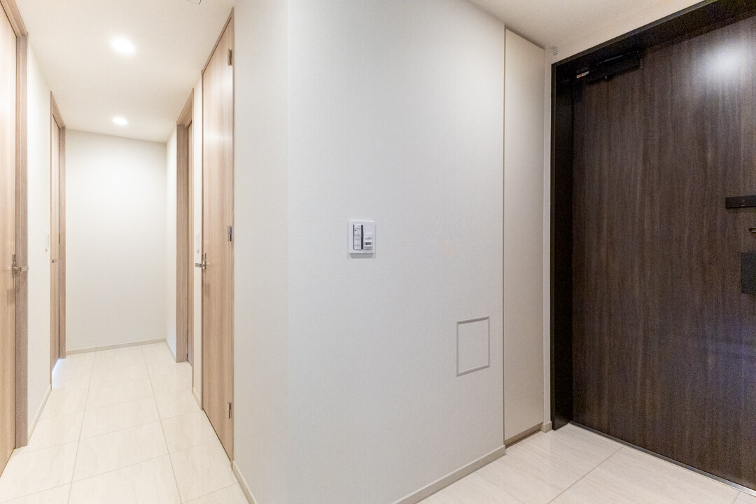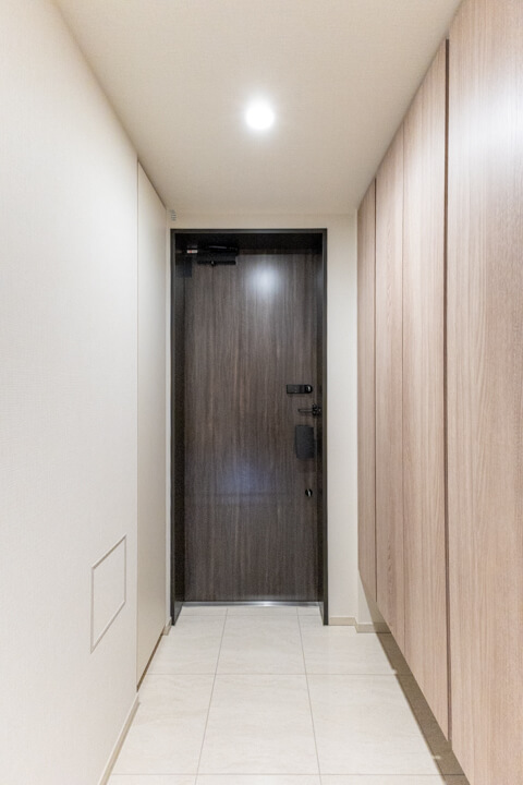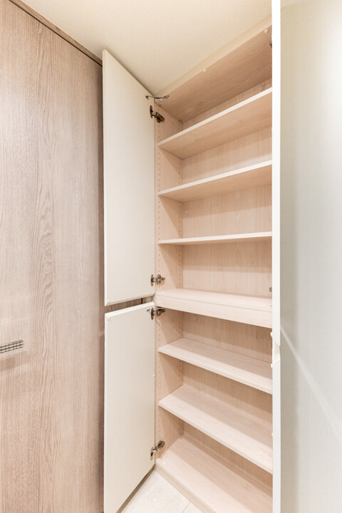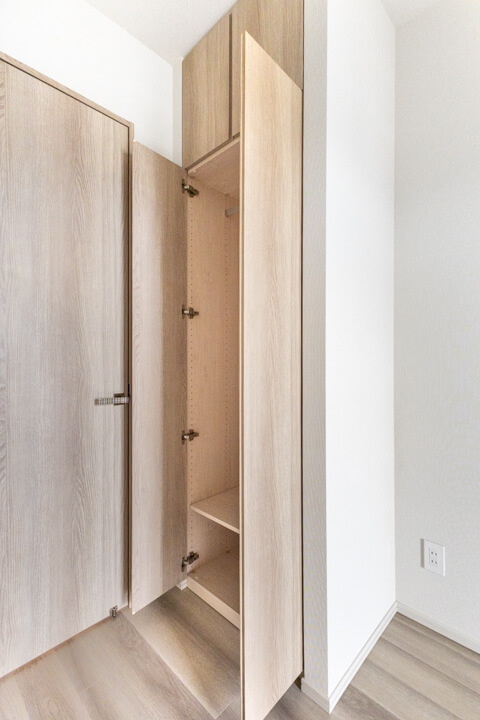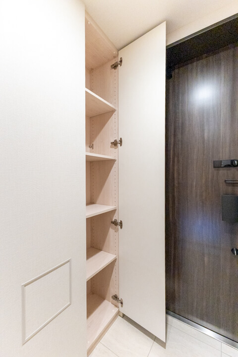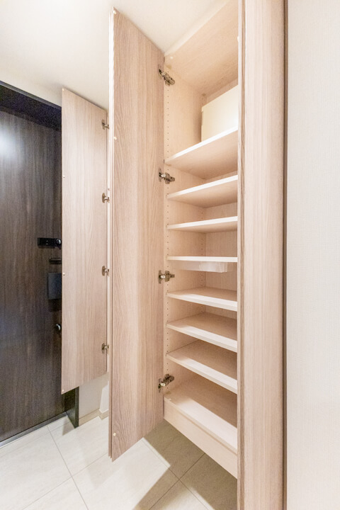玄関に4枚扉のシューズボックスを完備。ブーツなど高さのある靴もすっきり整頓できる可動棚仕様です。また、シューズボックスの対面側にも物入が備わっています。
