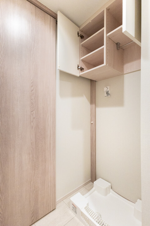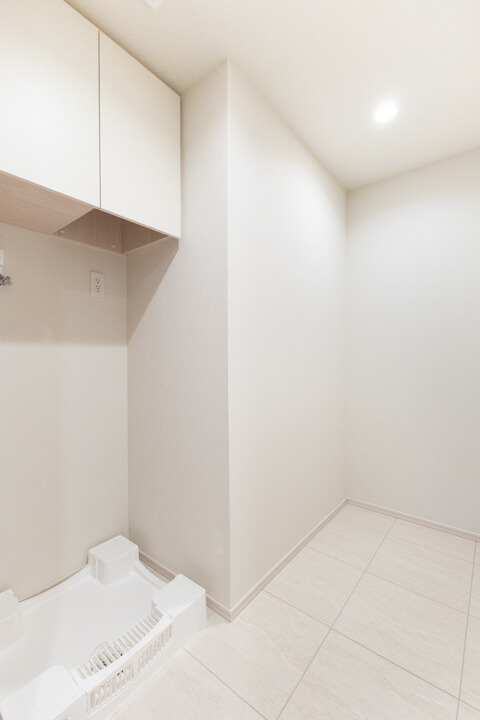 廊下を挟んで洗面室の対面側にはユーティリティスペースを完備。洗濯機置き場が設置されていて、生活感を目隠しできるメリットが◎。