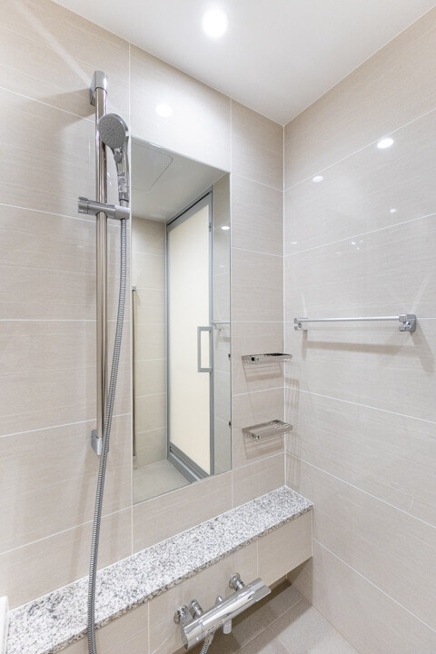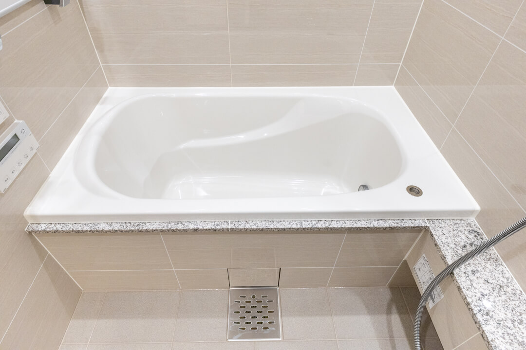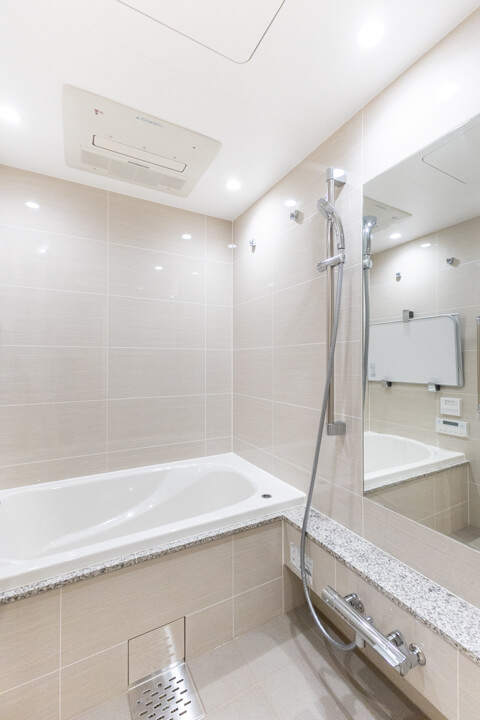 タイル貼りで上品な雰囲気が感じられるバスルーム。追い炊き機能の他、ミストサウナ・換気・乾燥・暖房の機能付きで一年中快適にバスタイムが楽しめます。