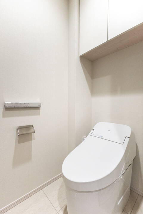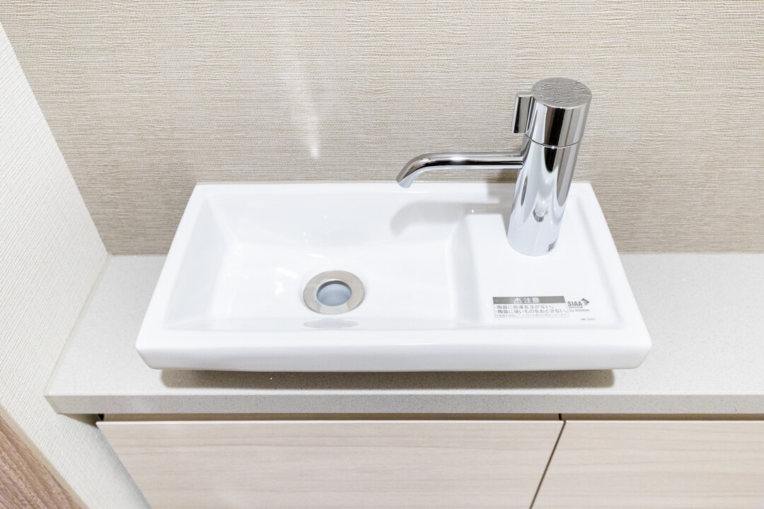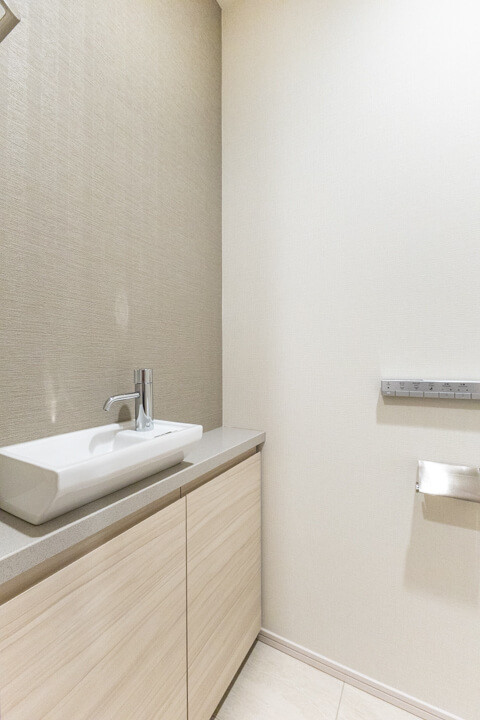 廊下に面したレストルーム。空間がすっきり見えるタンクレストイレです。独立型の手洗いカウンター、収納スペース付き。ウォシュレットリモコンはスティック型でスタイリッシュな印象です。