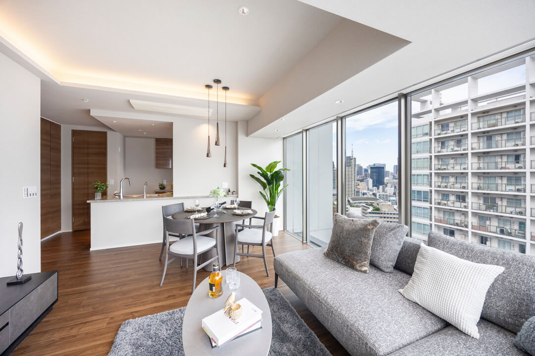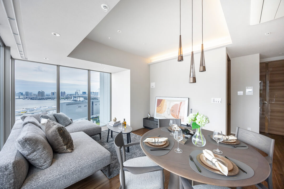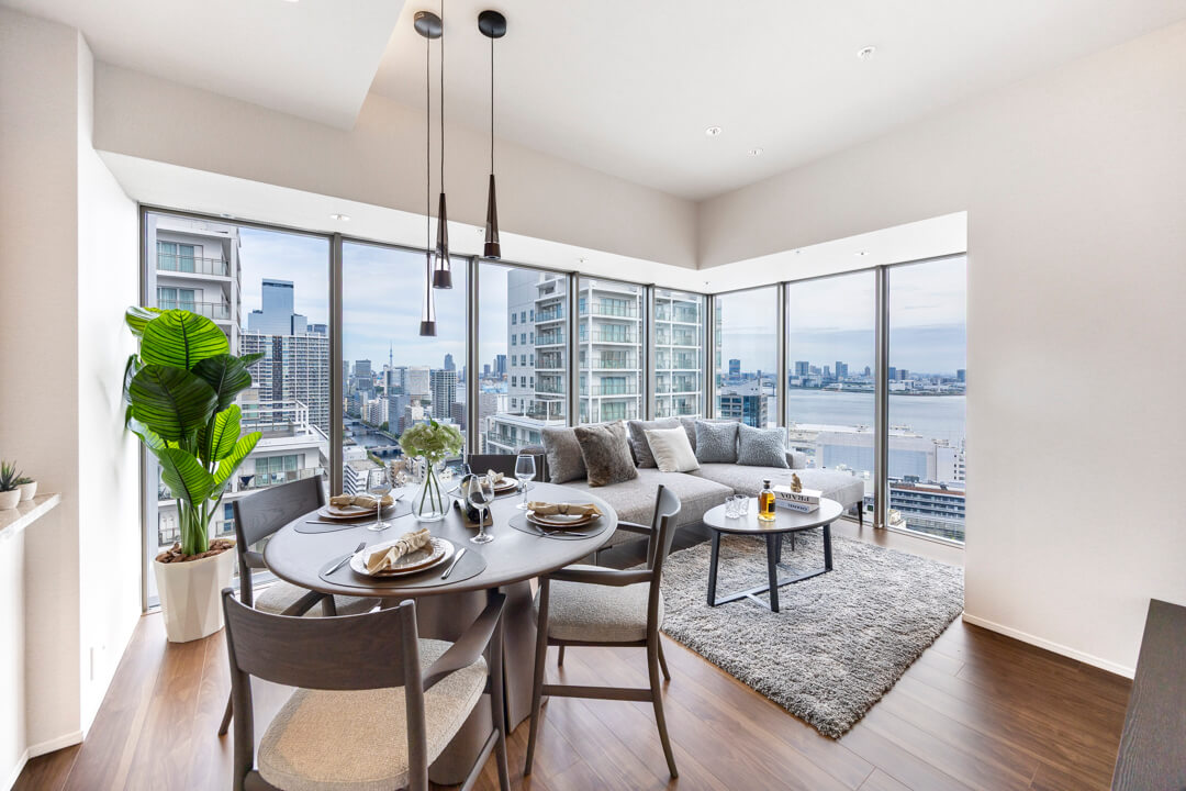 約17.5帖の広々としたリビングダイニングキッチンは、窓に囲まれた開放感溢れる空間です。窓からは東京湾の潤いを感じ、レインボーブリッジや東京スカイツリーなどを望むことができますよ。夜にはライトアップも楽しめそうですね。