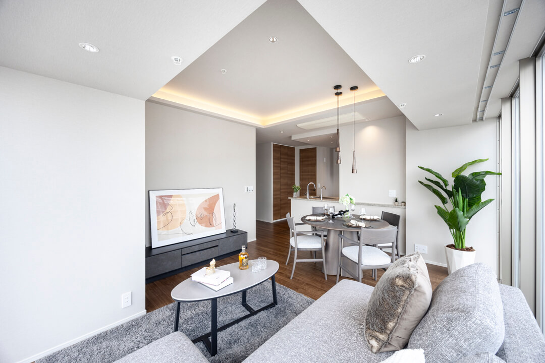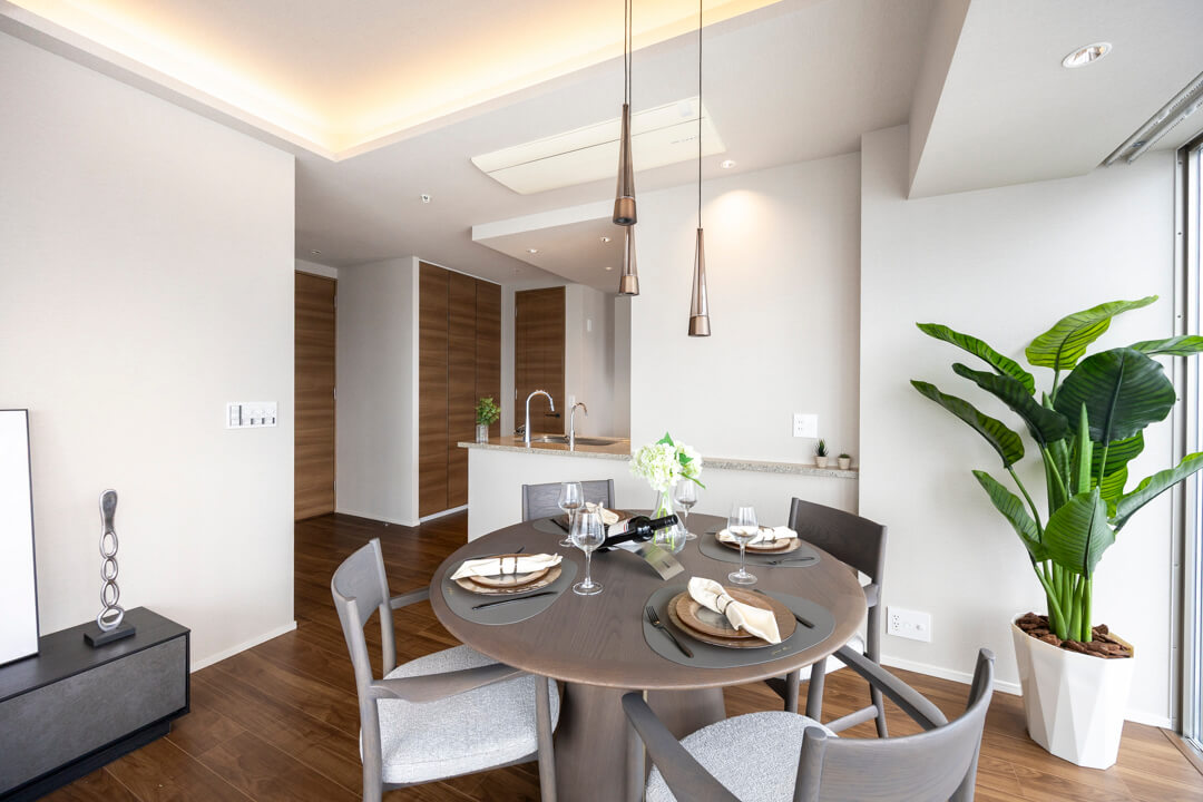 天井には間接照明があしらわれていて、お部屋を上品な雰囲気に包んでくれています。また、エアコンは埋め込み式のため、インテリアの邪魔にならないもの◎。