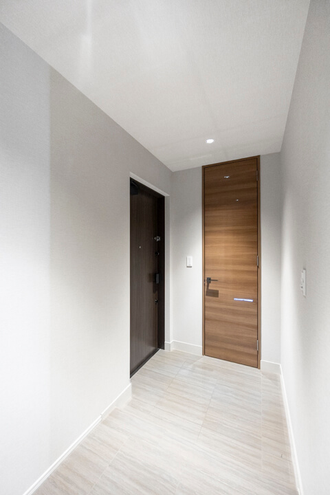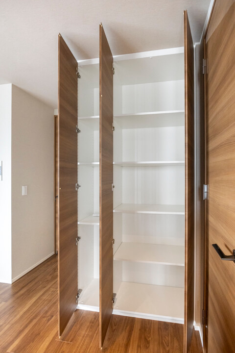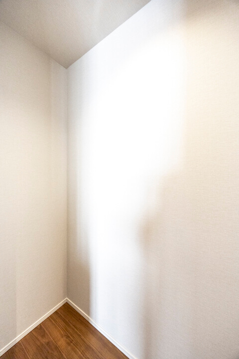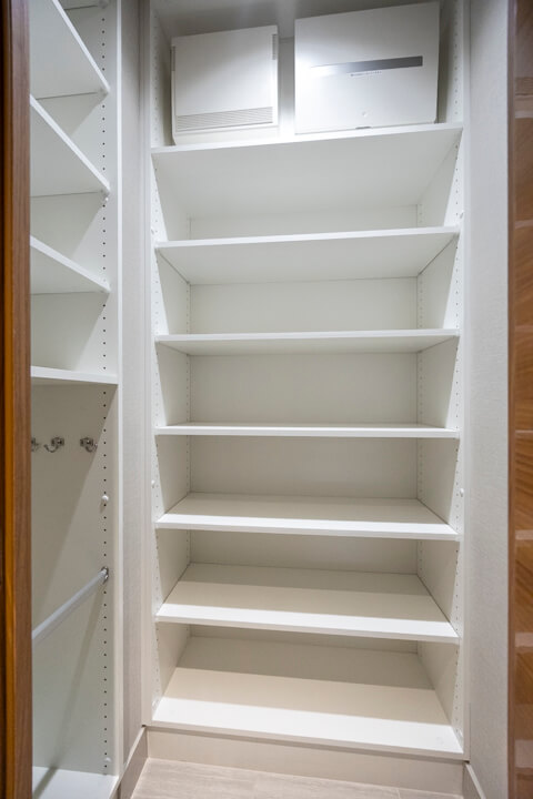 入口付近には、生活感が出がちな小物をすっきりと収納できる棚が造られています。さらに、約0.7帖の納戸もあるので、掃除機などの大きめの家電を収納することもできそうです。