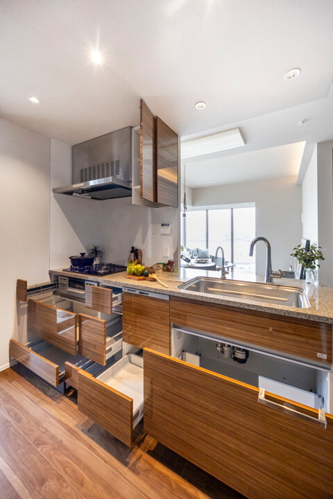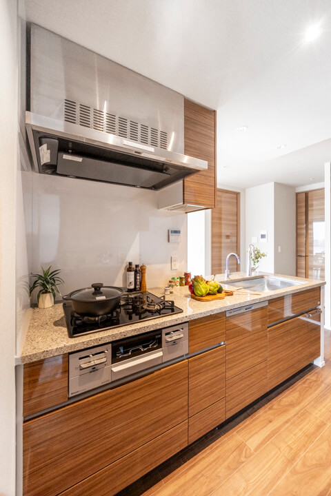 キッチンは、リビングダイニングを見渡しながら料理ができる対面式です。家族や来客とのコミュニケーションが取りやすくて◎。しかし、コンロ側には壁がたっているので、油跳ねなどの心配はありません。