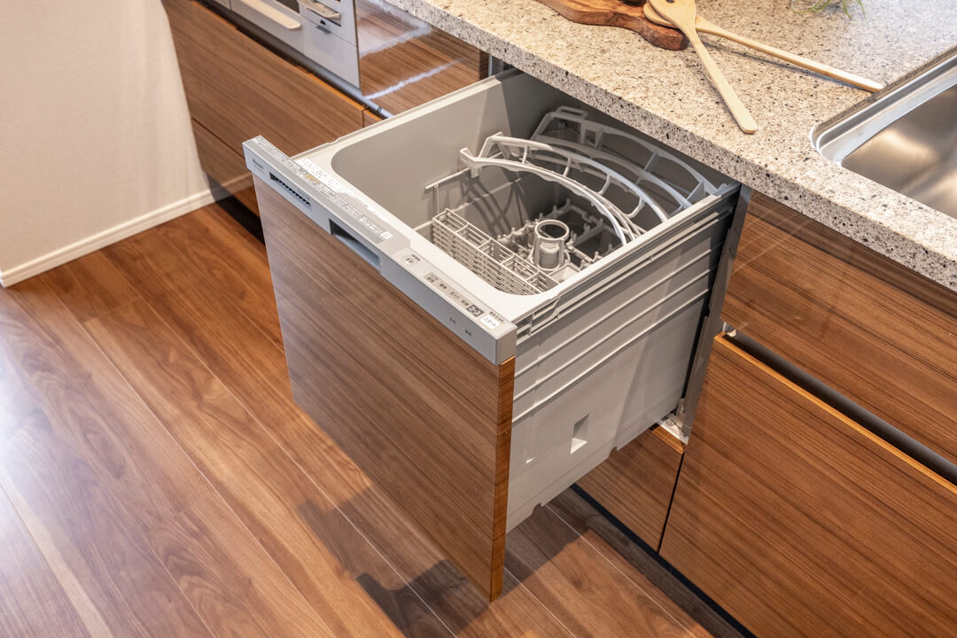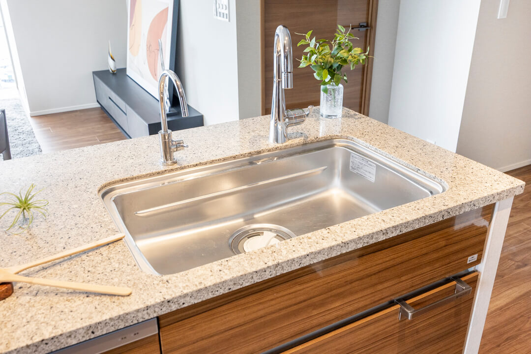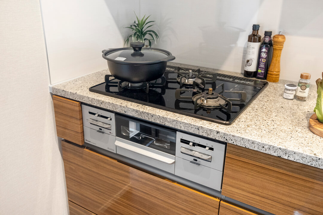 3口コンロ、グリル、ディスポーザー、食洗機付きと設備面も充実しています。シンクも広々としているので野菜などが洗いやすそうですよ。