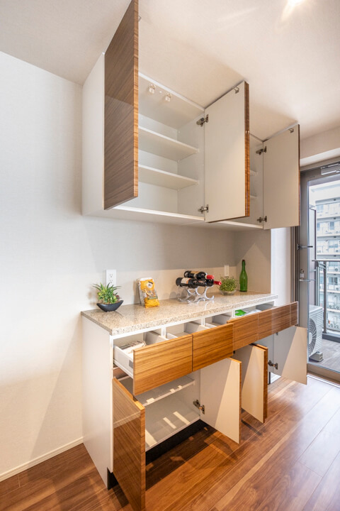 キッチンの背面側にはカップボードが備え付けられています。調味料や食器などを収納できるだけでなく、電子レンジなどを置くこともできるので便利です。