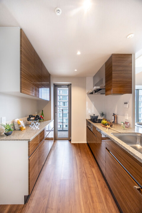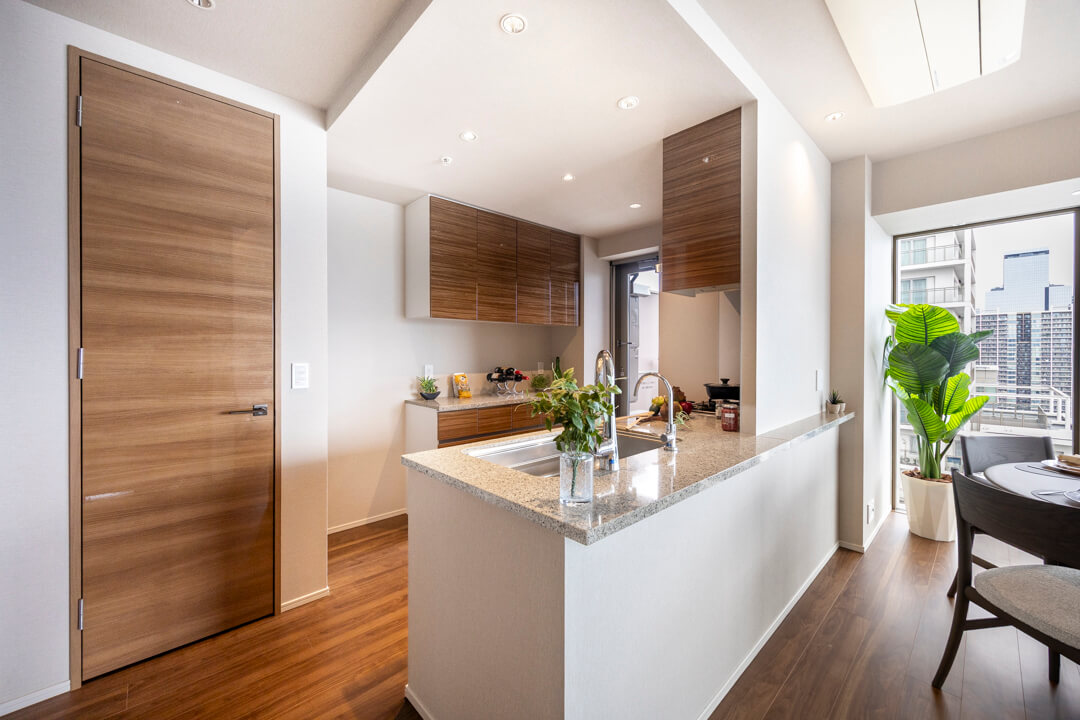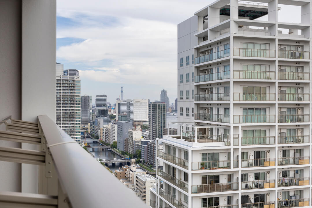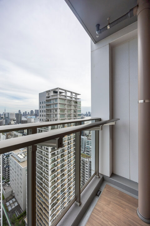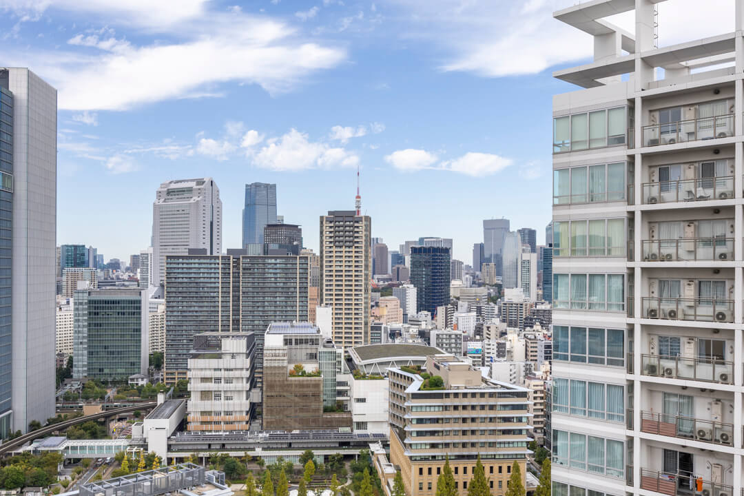 キッチンの奥からは北向きのバルコニーにアクセスができます。東京タワーや東京スカイツリーなどを望む都会的な眺望が広がっています。