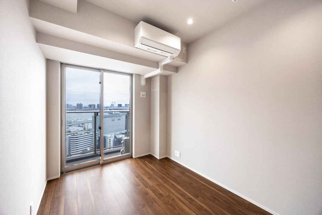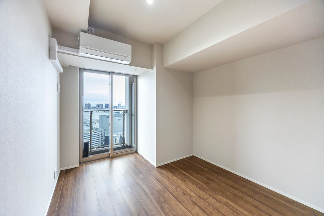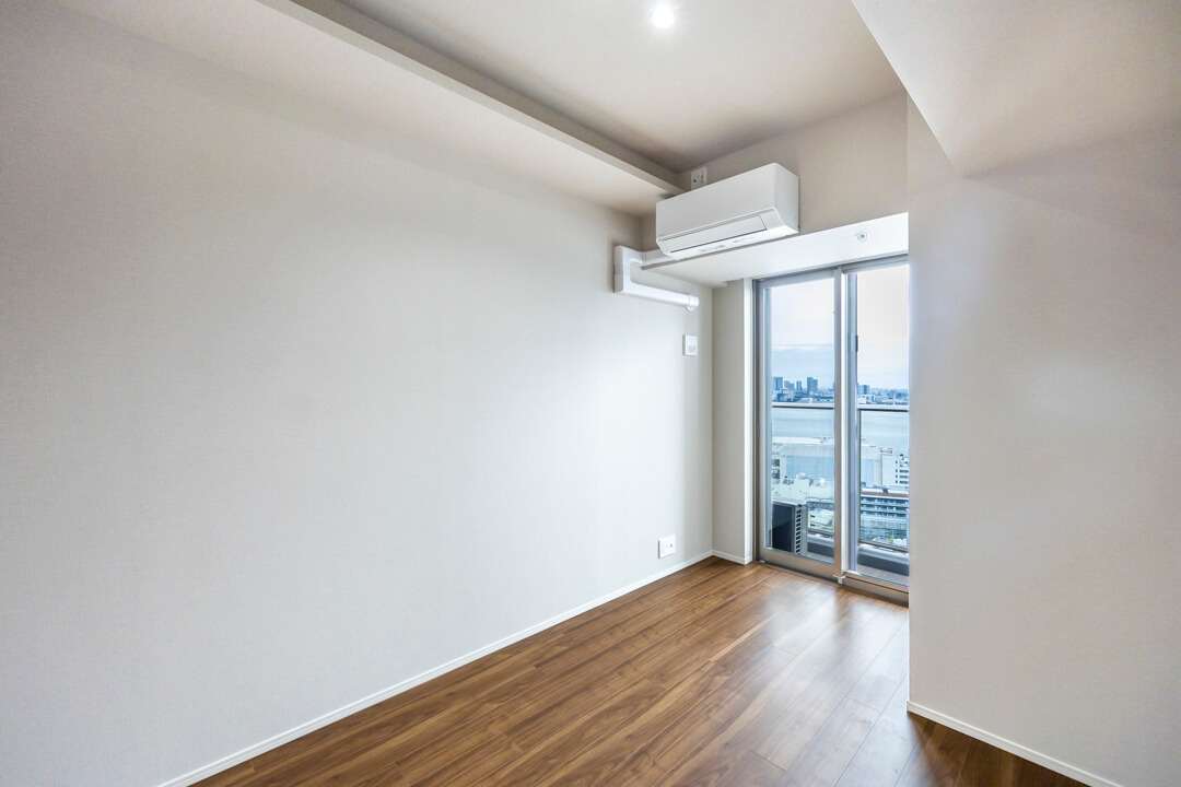 約5.5帖の寝室は、独立性があって子ども部屋に良さそうな空間です。パイプハンガーや棚が設置されていて、洋服なども収納しやすくなっています。バルコニー越しにレインボーブリッジが望めて眺望も良好です。